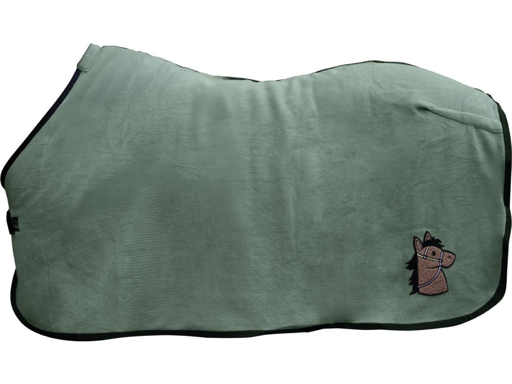 Derka chłodząca zaprojektowana specjalnie dla kuców szetlandzkich. Derka wykonana jest z miękkiego polaru, który skutecznie pochłania pot, zapewniając jednocześnie komfort termiczny. Dzięki miękkiej wyściółce w kłębie nie dochodzi do ucisku. Przednie metalowe zapięcie jest zabezpieczone rzepem, a między nogami i pod ogonem znajdują się pasy. Derka ozdobiona jest uroczą aplikacją z motywem głowy konia. Derka nadaje się do delikatnego prania. Przed włożeniem do pralki należy zapiąć rzep.