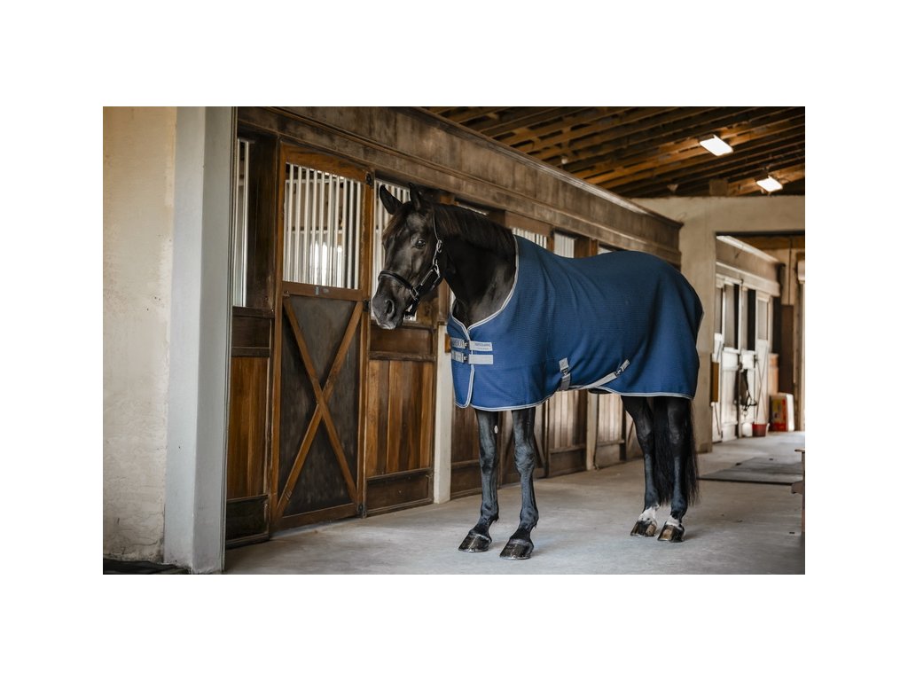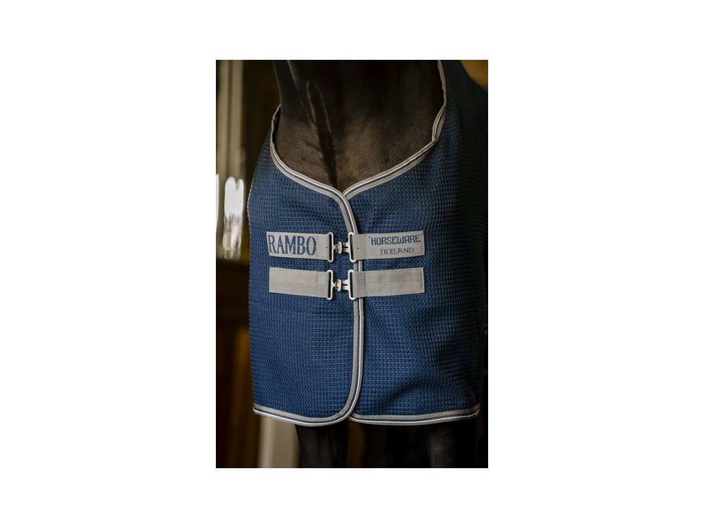 Niezwykle szybkoschnąca derka chłodząca Rambo Techni Waffle firmy Horseware. Wykonana z zewnętrznej tkaniny waflowej z plastikową powierzchnią i charakterystycznymi kwadratowymi wgłębieniami. Materiał ten skutecznie odprowadza wilgoć, jednocześnie utrzymując ciepło konia i pozwalając mu stopniowo się schłodzić. Derka jest bardzo lekka i oddychająca. Posiada podwójne zapięcie z przodu, odpinane zapięcie krzyżowe pod brzuchem i pasek na ogon. Idealna do stajni, podróży lub zawodów.