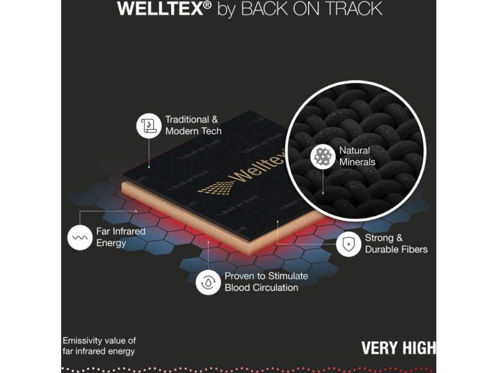 Tkanina Welltex® wychwytuje ciepło, które naturalnie emituje ciało, przekształca je w promieniowanie cieplne podczerwone, a następnie odbija je z powrotem do skóry, kości, mięśni i stawów. Promieniowanie podczerwone jest dobrze znanym rodzajem energii, który jest wykorzystywany do poprawy ogólnego samopoczucia i ma korzystny wpływ w szczególności na mięśnie i stawy. Odbite ciepło pomaga złagodzić napięcie mięśni i wspomaga przepływ krwi, co może przyspieszyć proces regeneracji po urazach i przeciążeniach. Ponieważ ludzie i zwierzęta emitują ciepło ciała zarówno podczas odpoczynku, jak i podczas aktywności fizycznej, produkty mogą być stosowane w obu sytuacjach. Jednak podczas odpoczynku promieniowanie jest niższe niż podczas aktywności fizycznej. Najskuteczniej jest używać produktów na najbardziej obciążone obszary. Produkty Back on Track® działają naturalnie i generują własne ciepło, więc nie ma ryzyka, że zostaną uznane za doping. Nie dodano żadnego zewnętrznego źródła ciepła. Rezultatem jest stałe, kojące ciepło, które jest generowane wyłącznie przez odbicie ciepła ciała.
