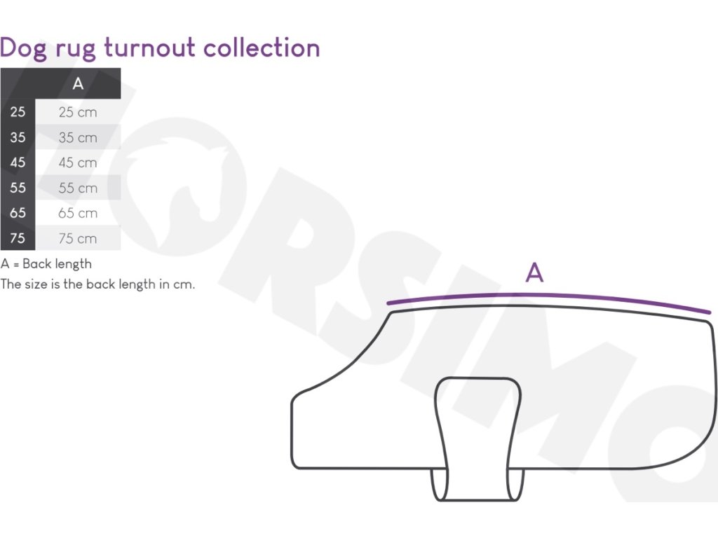 Aby znaleźć odpowiedni rozmiar, zmierz całkowitą długość grzbietu od kłębu do nasady ogona. Jeśli zmierzona długość wypada pomiędzy dwoma rozmiarami, zamów rozmiar większy. Podany rozmiar odnosi się do górnej (tylnej) długości derki.