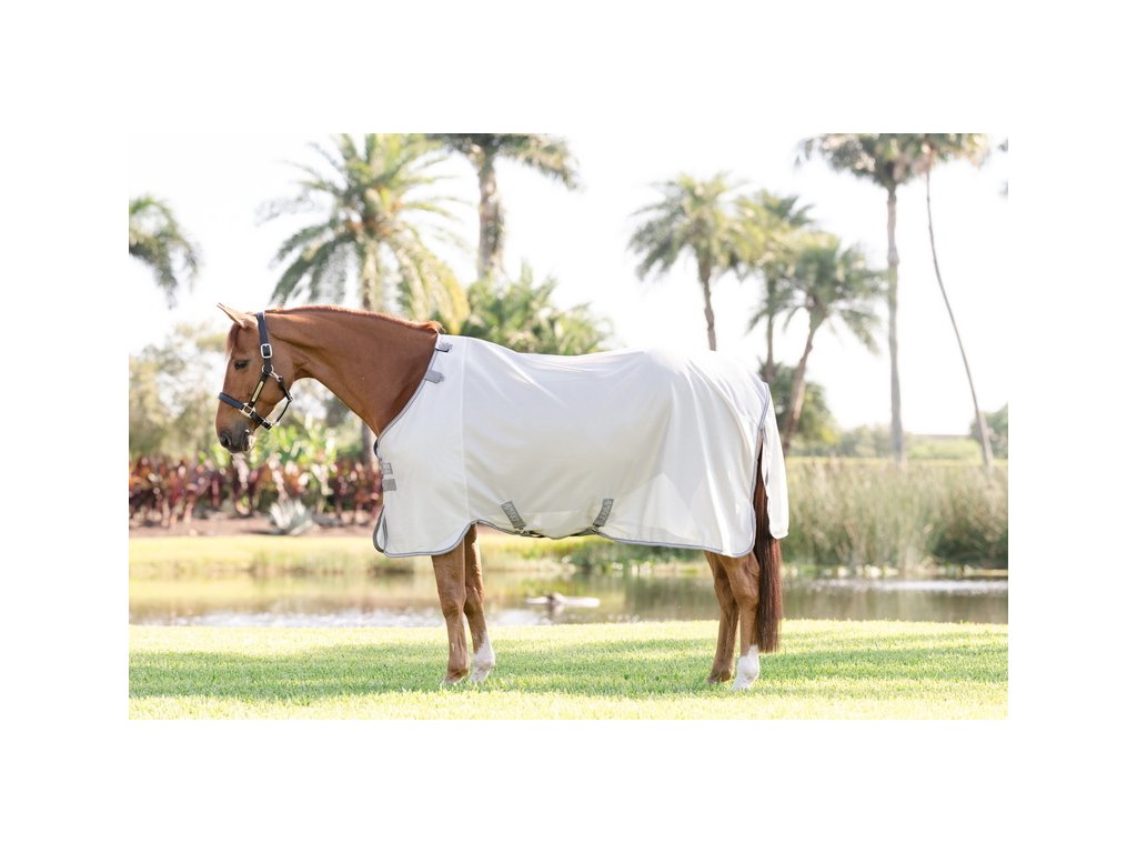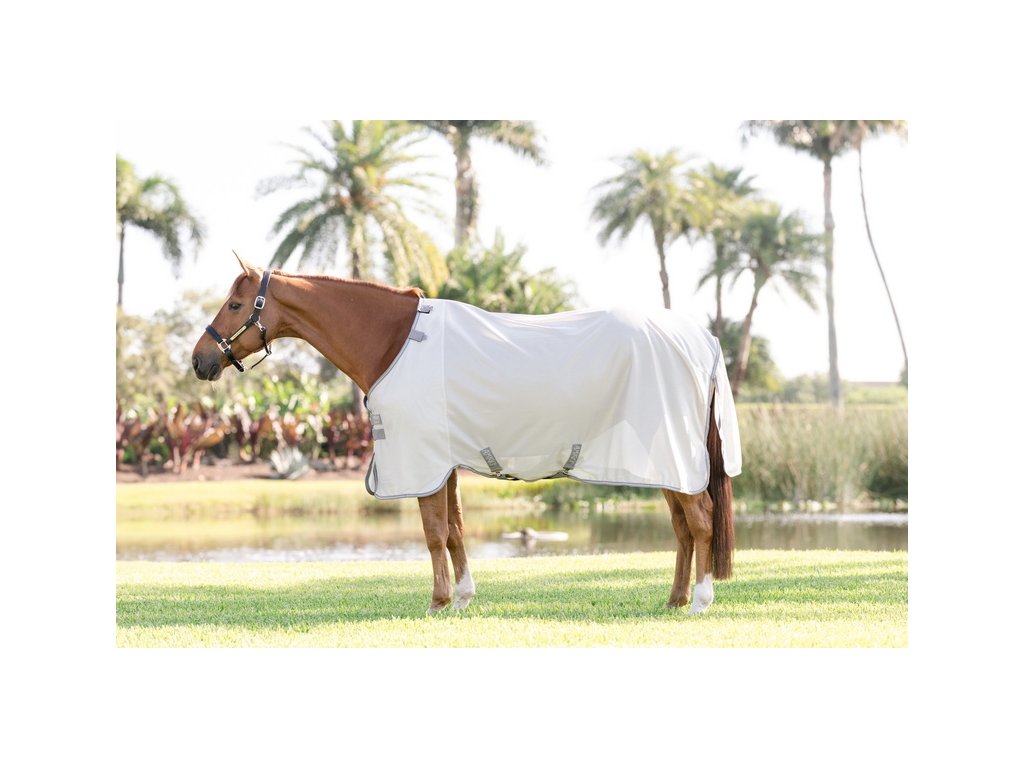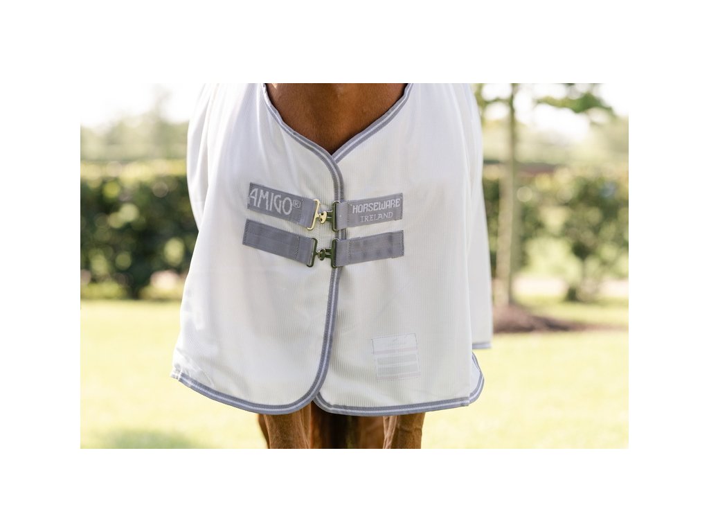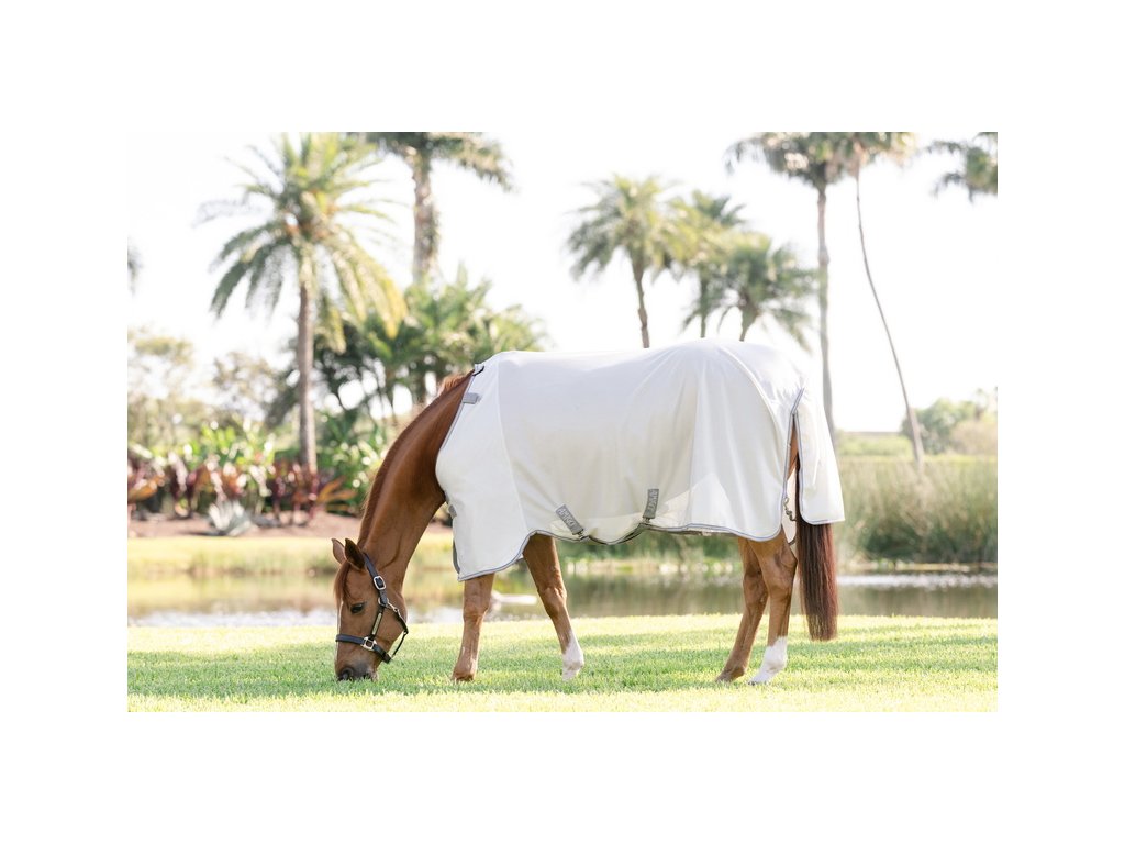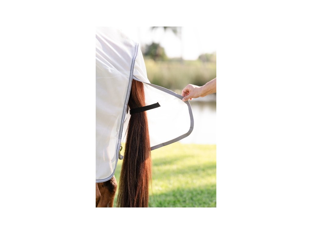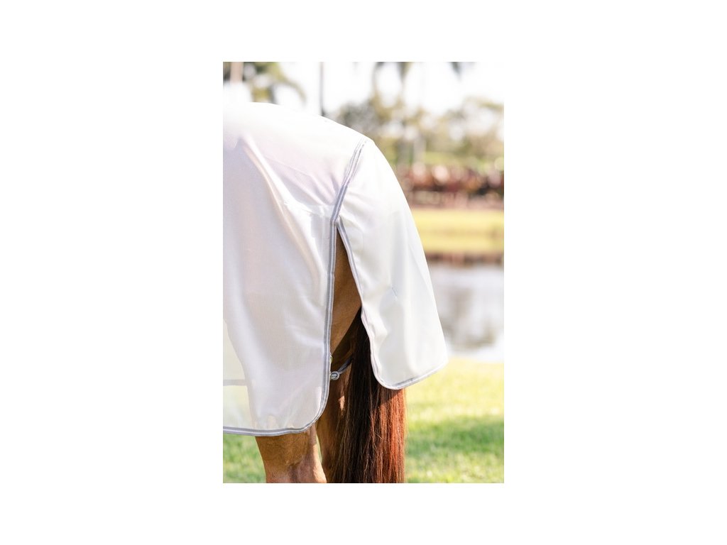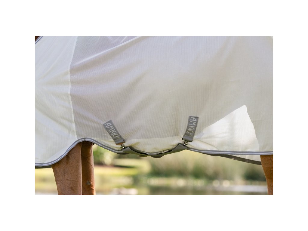 Derka Amigo Bug to miękka, oddychająca i lekka derka, która odbija światło słoneczne i zapewnia wyjątkową ochronę nie tylko przed owadami, ale także przed promieniowaniem UV. Wykonana z oddychającego i niezwykle lekkiego materiału poliestrowego o wysokiej odporności na rozdarcie. Derka posiada podwójne zapięcie z przodu na sprzączki, zapięcie krzyżowe pod brzuchem oraz ochraniacz na ogon ze ściągaczem. Element na szyję można zakupić osobno.