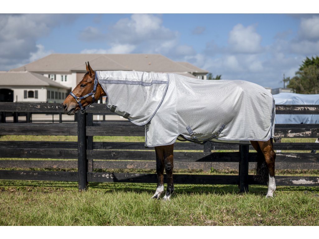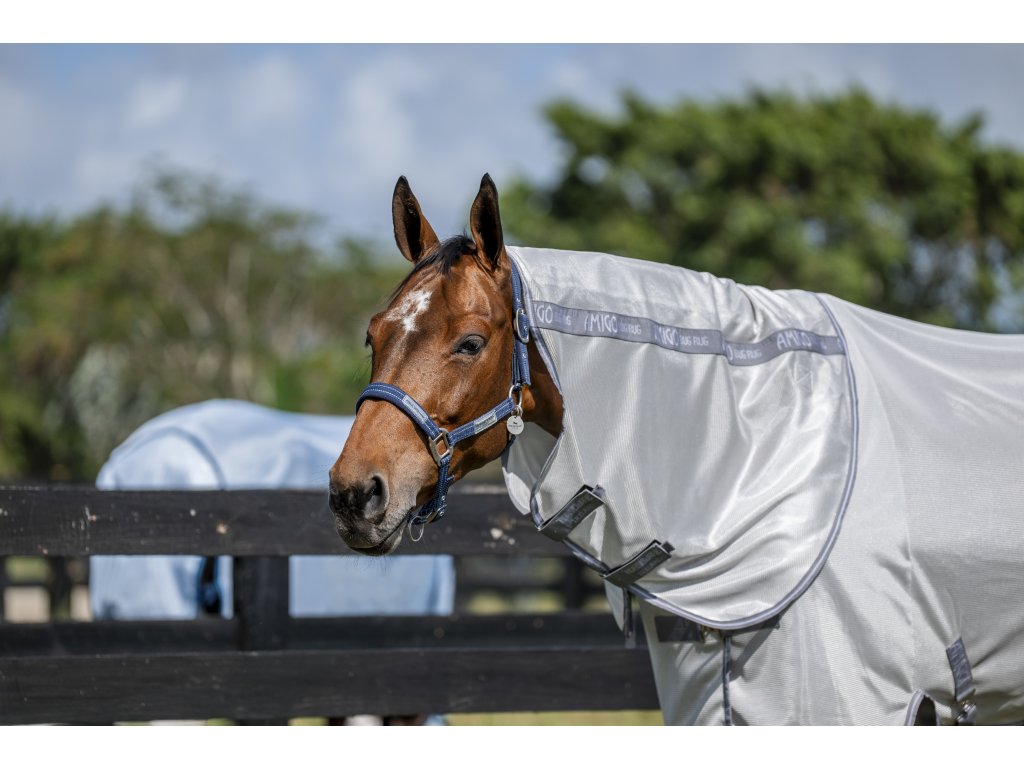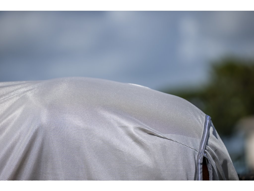 Derka Amigo Bug Plus Buster, która zapewnia skuteczną ochronę przed owadami i promieniowaniem UV. Dostarczana wraz z odpinanym elementem na szyję. Ten model zapewnia doskonałą wydajność bez kompromisów. Materiał zewnętrzny wykonany jest z wytrzymałego, lekkiego poliestru siatkowego. Wyposażona w podwójne zapięcie z przodu, krzyżowe zapięcie pod brzuchem, przedłużony ochraniacz na ogon i pasek na ogon. Anatomiczny krój w okolicy nóg zapewnia maksymalną swobodę ruchów. Podszewka w okolicy łopatek i grzywy chroni przed otarciami.