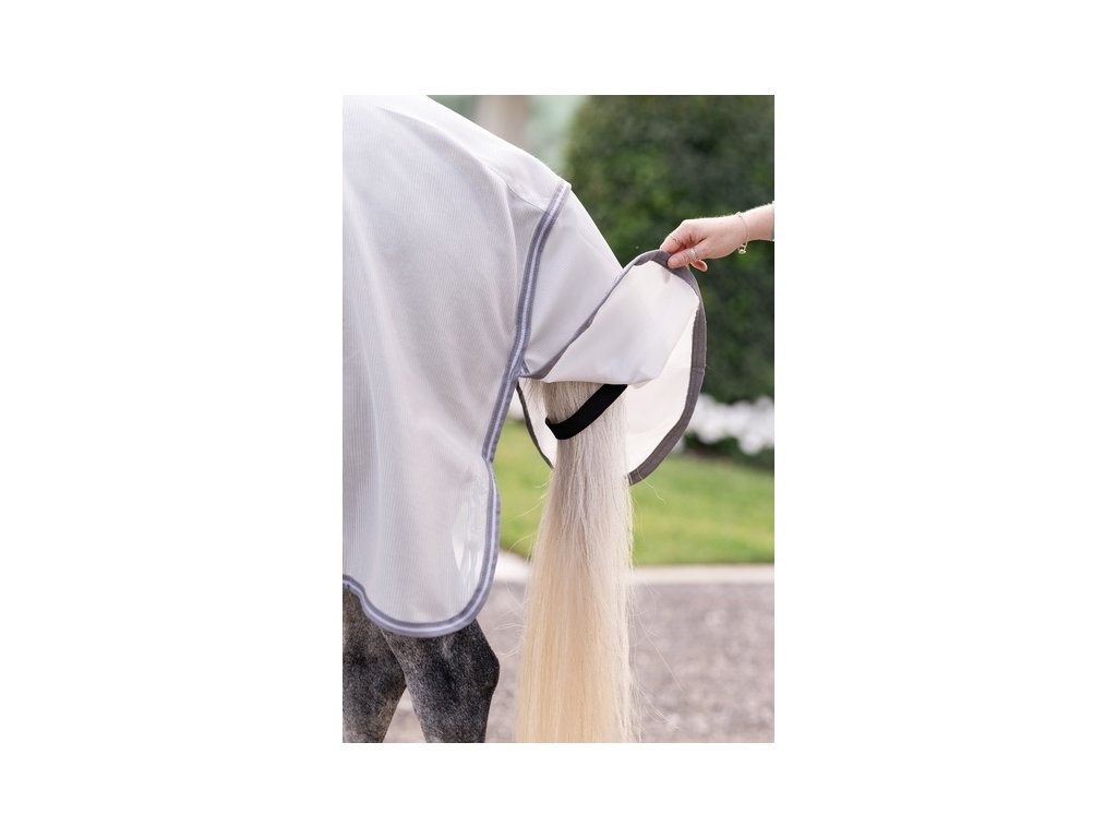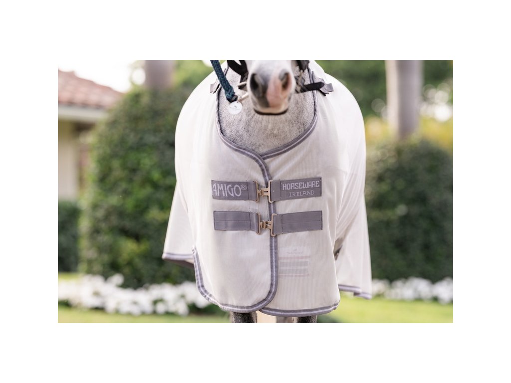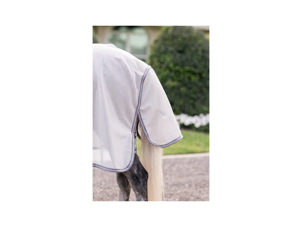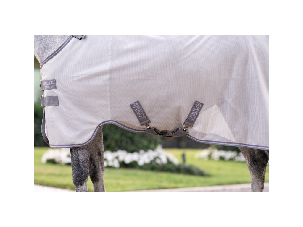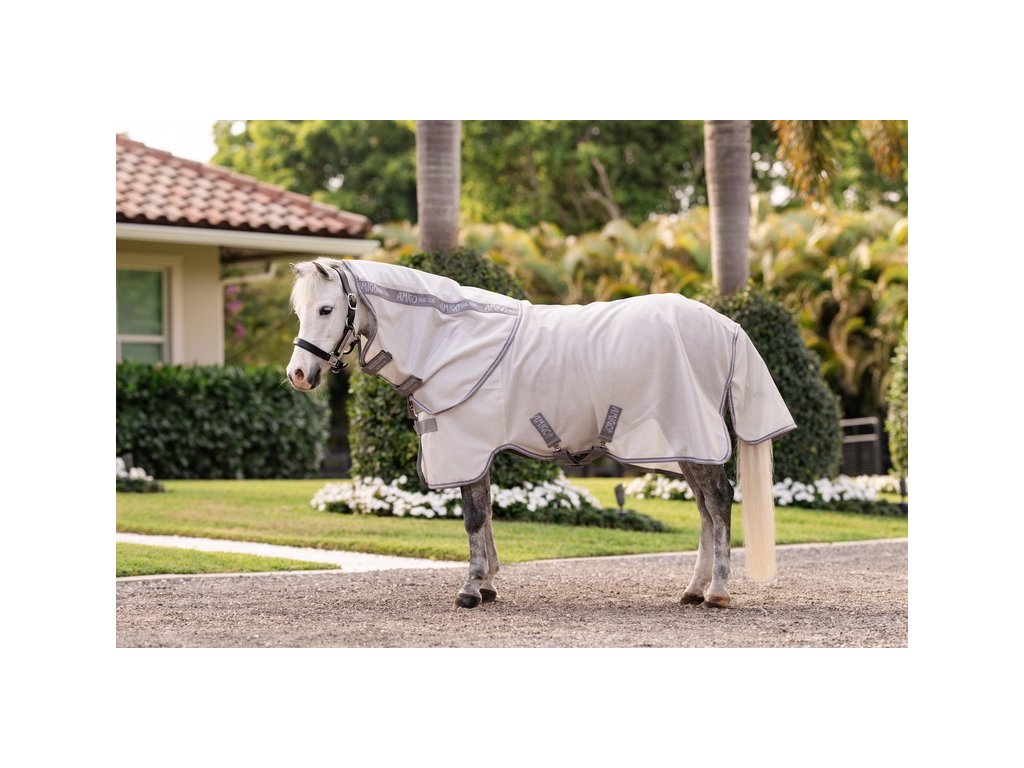 Amigo Bug Plus Pony to miękka, oddychająca i lekka derka, która odbija światło słoneczne i zapewnia wyjątkową ochronę nie tylko przed owadami, ale także przed promieniowaniem UV. Wykonana z oddychającego i niezwykle lekkiego materiału poliestrowego o wysokiej odporności na rozdarcie. Derka posiada podwójne zapięcie z przodu na sprzączki, zapięcie krzyżowe pod brzuchem oraz ochraniacz na ogon ze ściągaczem. Dostarczana wraz z odpinanym elementem na szyję. W rozmiarach dla kuców.