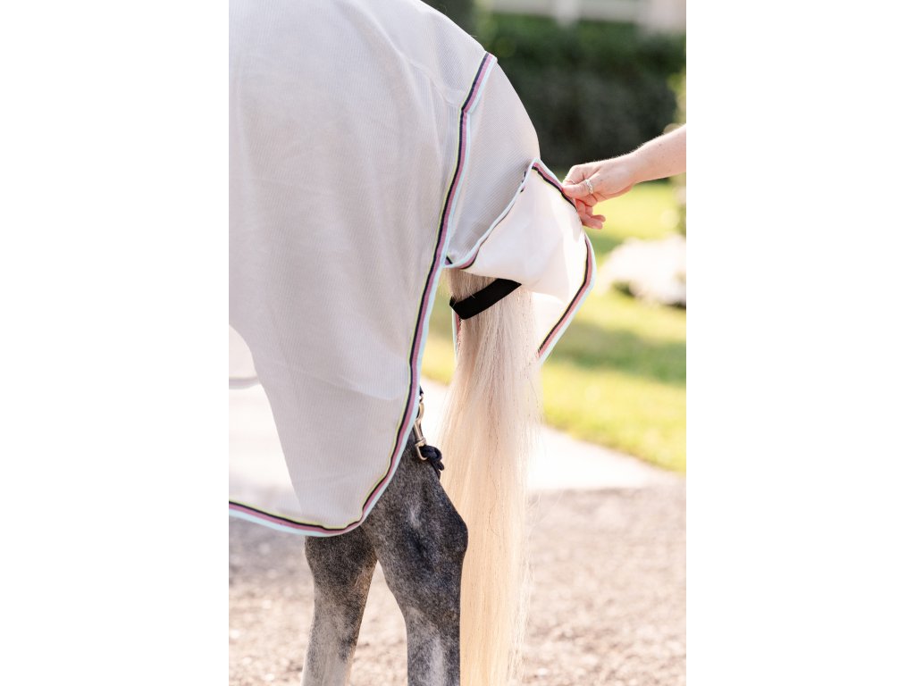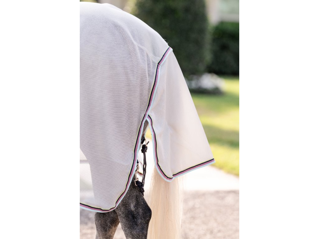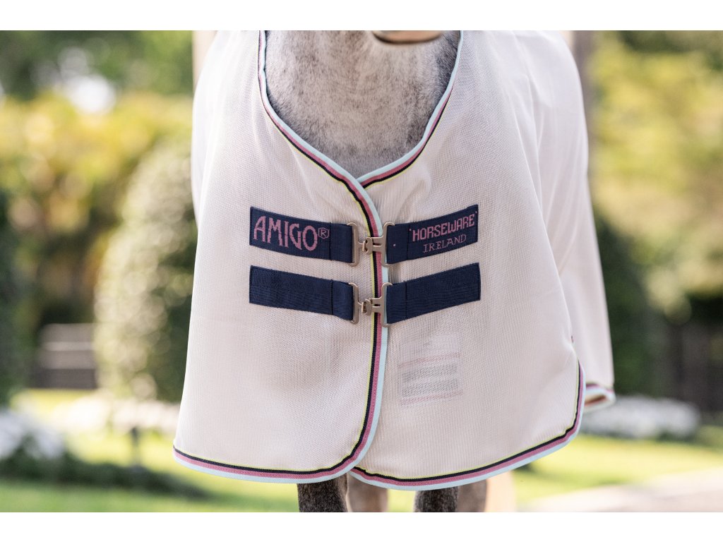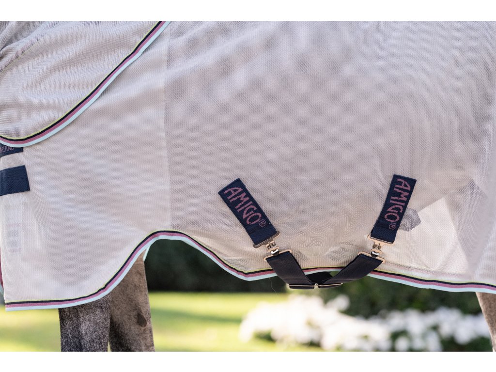 Derka Amigo Bug Pony przeciw insektom to miękka, oddychająca i lekka derka, która odbija światło słoneczne i zapewnia wyjątkową ochronę nie tylko przed insektami, ale także przed promieniowaniem UV. Wykonana z oddychającego i niezwykle lekkiego materiału poliestrowego o wysokiej odporności na rozdarcie. Derka posiada podwójne zapięcie z przodu na sprzączki, zapięcie krzyżowe pod brzuchem oraz ochraniacz na ogon ze ściągaczem. Element na szyję można zakupić osobno. W rozmiarach dla kuców.