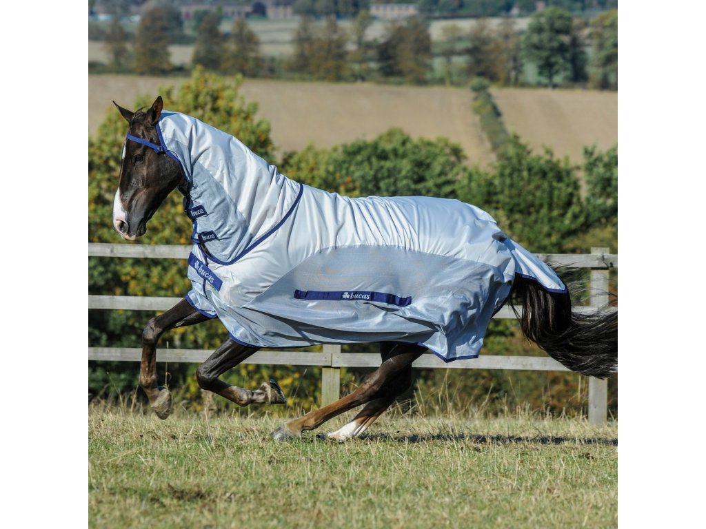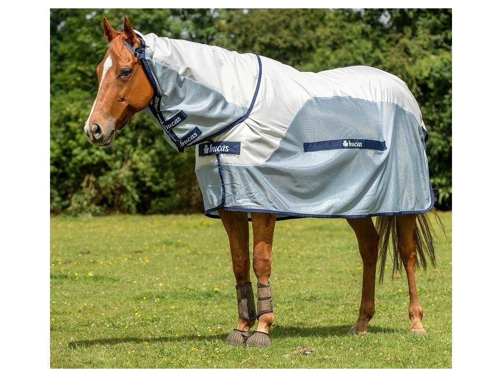 Bucas prezentuje najpopularniejsze derki przeciw owadom z serii Buzz-Off, ten model, Buzz-Off Rain & Neck, jest dostarczany z odpinanym elementem na szyję. Buzz-Off Rain to derka, która łączy w sobie derkę przeciw owadom i płaszcz przeciwdeszczowy. Górna część na grzbiecie i szyi wykonana jest z wodoodpornego i wysoce oddychającego materiału, który pomaga chronić konia przed przelotnymi opadami deszczu. Cała seria derek Buzz-Off jest wykonana ze specjalnej, lekkiej tkaniny siatkowej, która zapewnia skuteczną ochronę przed owadami i 75% ochronę przed promieniowaniem UV. Materiał siatkowy jest bardzo trwały, miękki i skutecznie odbija światło słoneczne. W okolicy łopatki i kłębu derka jest wyściełana specjalną jedwabną podszewką, która szczególnie chroni przed otarciami. Idealnie dopasowuje się dzięki marszczonemu materiałowi w okolicy łopatek. Z przodu znajduje się proste zapięcie typu T wraz z magnetycznym zatrzaskiem Snap-lock, a całość uzupełnia ochronny rzep. Również pełne zakrycie brzucha, pasek pod ogonem, paski na nogi i ochrona ogona. Elastyczna taśma przy uszach utrzymuje element na szyję na miejscu.