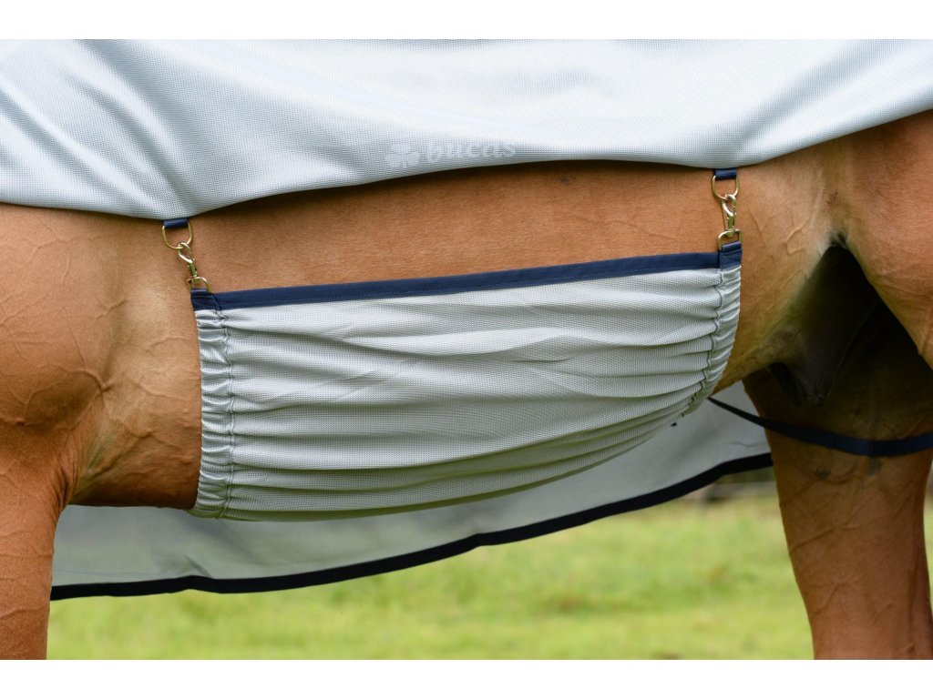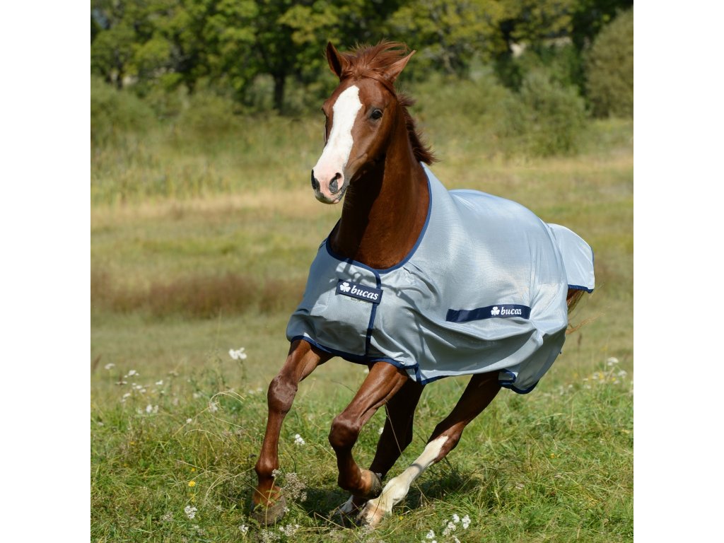 Producent Bucas prezentuje najpopularniejsze derki przeciw owadom z serii Buzz-Off, ten model Buzz-Off Classic Cut nie posiada części na szyję. Cała seria derek Buzz-Off jest wykonana ze specjalnej, lekkiej tkaniny siatkowej, która zapewnia skuteczną ochronę przed owadami i 75% ochronę przed promieniowaniem UV. Materiał siatkowy jest bardzo trwały, miękki i skutecznie odbija światło słoneczne. W okolicy łopatki i kłębu derka jest wyściełana specjalną jedwabną podszewką, która szczególnie chroni przed otarciami. Idealnie dopasowuje się dzięki marszczonemu materiałowi w okolicy łopatek. Z przodu znajduje się proste zapięcie typu T wraz z magnetycznym zatrzaskiem Snap-lock, a całość uzupełnia ochronny rzep. Również pełne zakrycie brzucha, pasek pod ogonem, paski na nogi i ochrona ogona.