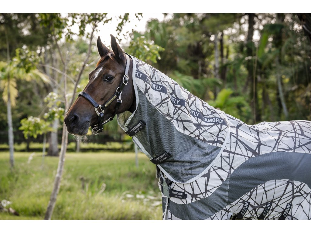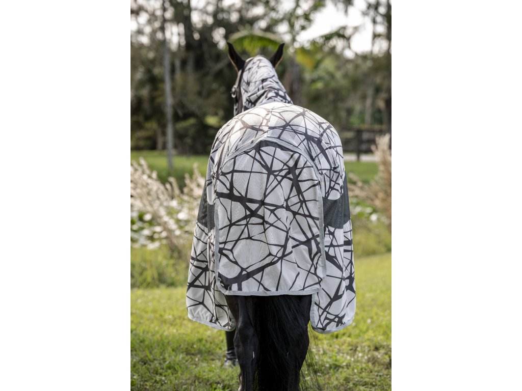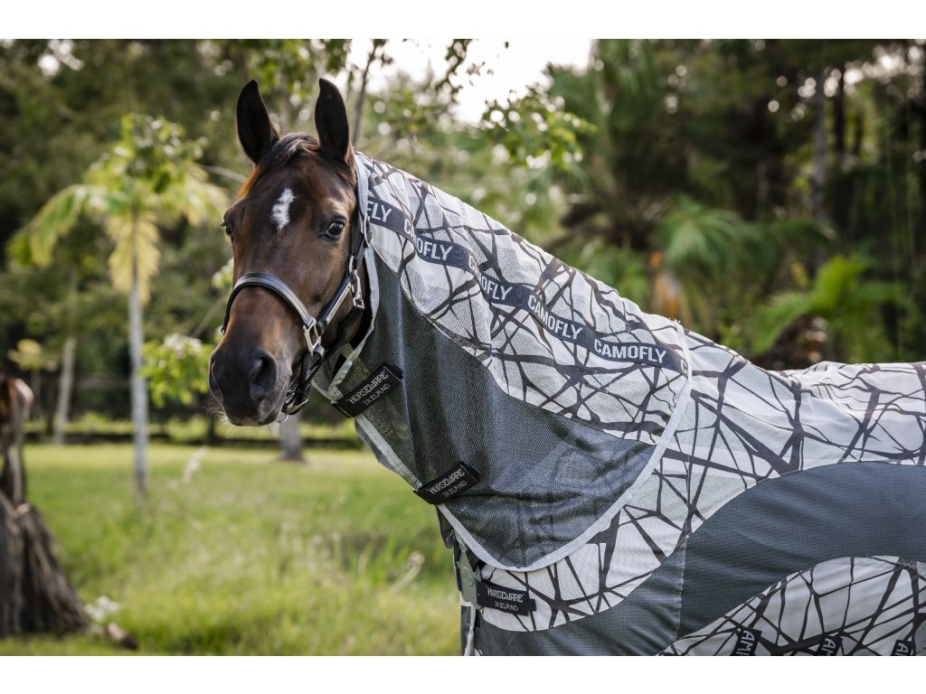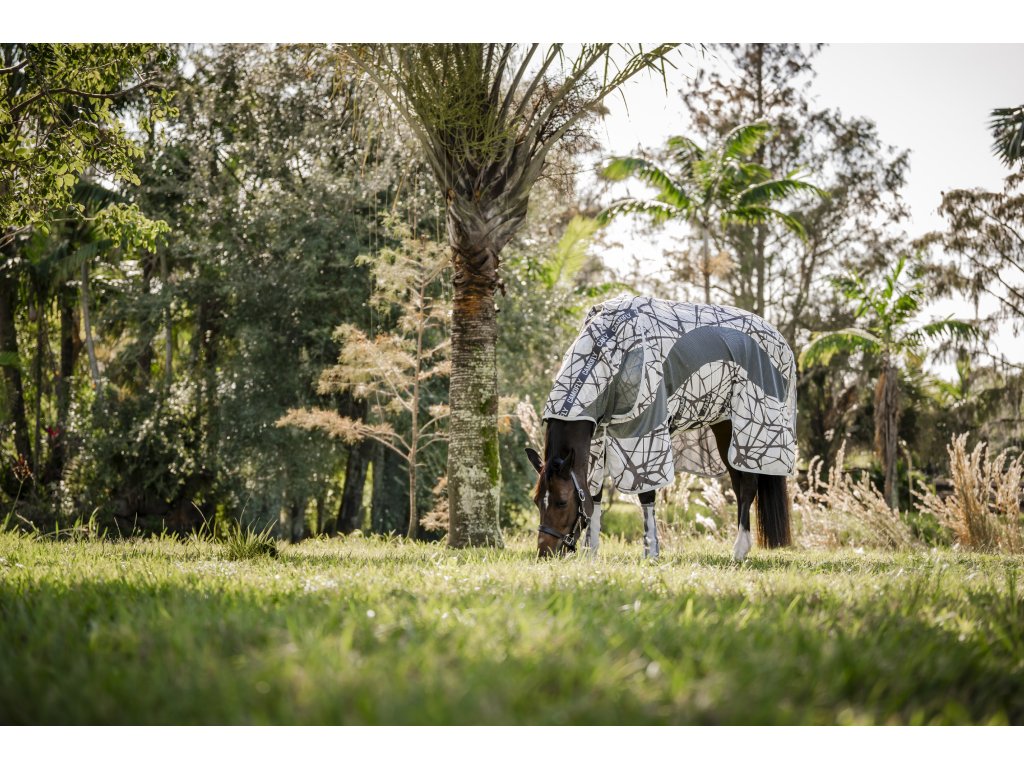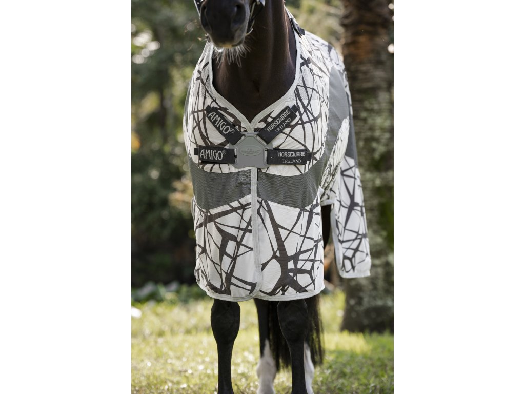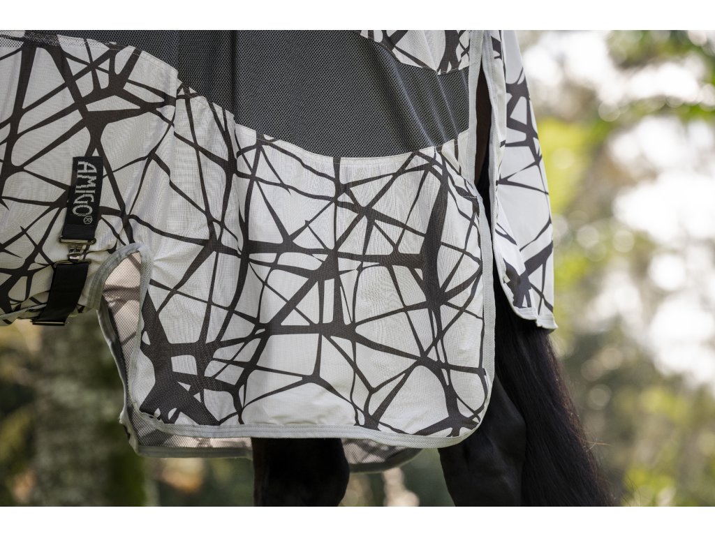 Derka siatkowa Amigo jest ultralekka, zapewniając doskonałą ochronę przed owadami i 65% ochronę UV. Innowacyjny projekt przeszedł szereg badań, które wykazały, że pasy zebry działają odstraszająco i dezorientują owady. Warstwowe czarne linie na szarym tle działają jak iluzja optyczna dla much. Wzór rozbija sylwetkę konia, przez co owad nie jest w stanie go zidentyfikować jako cel. Derka wykonana jest z odpornego na rozdarcie siatkowego materiału poliestrowego. Wyposażona w bardzo praktyczne i proste zapięcie dyskowe z przodu. Ponadto pełne pokrycie brzucha z potrójnym zapięciem, pasem na ogon, przedłużoną osłoną ogona i przedłużonym wycięciem w okolicy nóg. Dostarczana z odpinanym elementem na szyję.