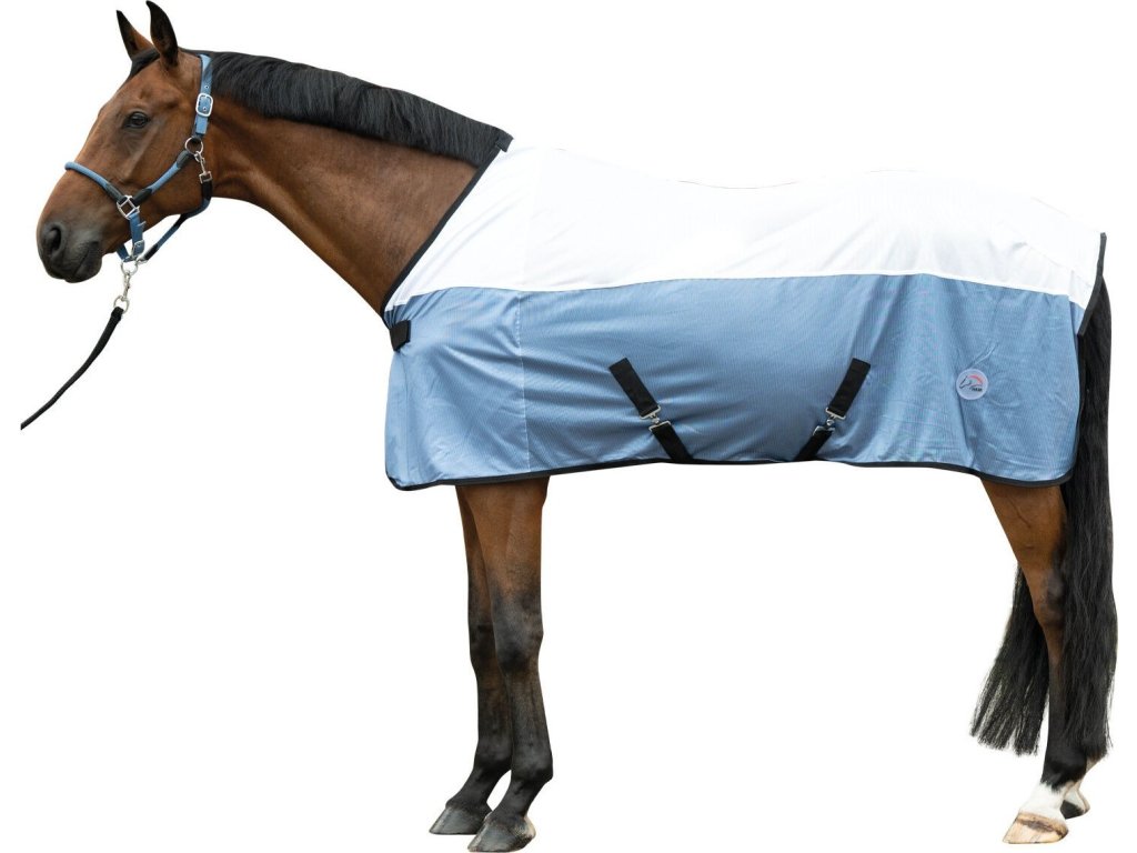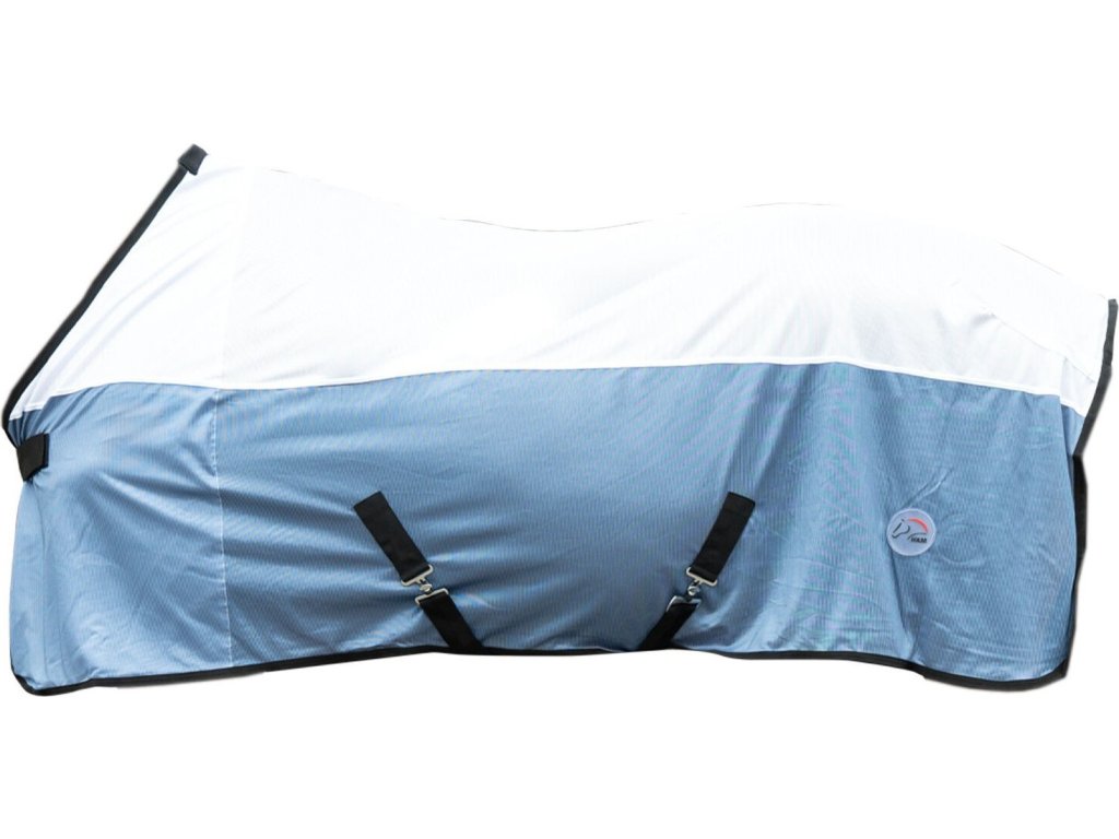 Siatkowa derka chroniąca konie przed owadami. Wyposażona w proste zapięcie z przodu i odpinane zapięcie krzyżowe pod brzuchem. Derkę można kupić z maską przeciw owadom w tym samym kolorze. Można prać w pralce w temperaturze 30 stopni. Dostarczana w praktycznej torbie.