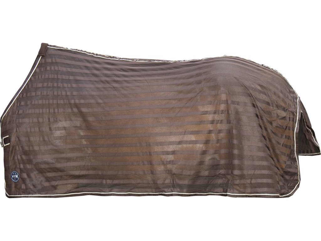 Lekka i oddychająca derka przeciw owadom firmy HKM. Derka jest wyposażona w proste zapięcie na klamrę z przodu i sznurek pod ogonem. Posiada również miękkie podszycie na kłębie, co zapewnia dodatkowy komfort. Jest ozdobiona subtelną, prążkowaną lamówką i ma ogólny, jasny prążkowany wzór. Dostępne w wielu kolorach i rozmiarach.