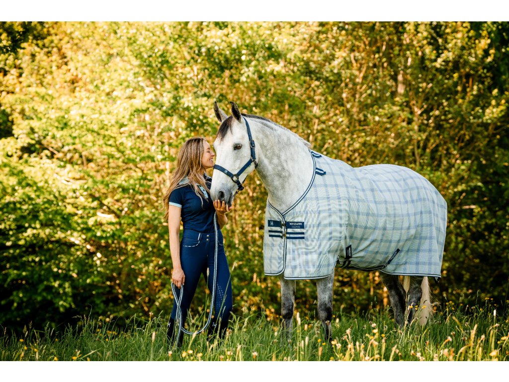 Horseware Pony Newmarket to stylowa derka przeciw owadom, która zapewnia również ochronę przed promieniowaniem UV. Wykonana z innowacyjnej, oddychającej i wytrzymałej siateczki poliestrowej, która zapewnia optymalną cyrkulację powietrza. Wzornictwo inspirowane jest kultowym wzorem w paski, który nadaje derce niepowtarzalny i stylowy wygląd. Derka jest wyposażona w wyjątkowo długi ochraniacz na ogon, pasek na ogon, podwójne zapięcie z przodu i zapięcie krzyżowe pod brzuchem. Dzięki anatomicznemu krojowi w okolicy nóg koń ma wystarczającą swobodę naturalnego ruchu.