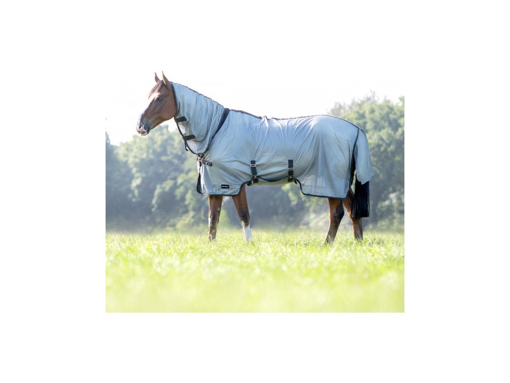 Derka przeciw owadom z ochroną szyi, brzucha i ogona. Derka wykonana jest z wytrzymałego, miękkiego materiału, podszyta gładką satynową podszewką na grzywie, klatce piersiowej i karku. Jest szybkoschnąca i oddychająca. Kaptur jest elastyczny z zapięciem na rzep i pętelką do mocowania do kantara. Posiada również anatomicznie wyprofilowaną osłonę na brzuch, która jest elastyczna i regulowana w razie potrzeby. Zapięcie na klatce piersiowej z klamrą V-Quick-Snap ze zintegrowanym podwójnym rzepem i wymiennymi karabińczykami. Klapa ogonowa i pasek na ogon. Dostępna w klasycznych rozmiarach 115cm-165cm oraz w rozszerzonych rozmiarach 128cm-158cm, które są odpowiednie dla koni o bardziej masywnych szyjach i klatkach piersiowych.