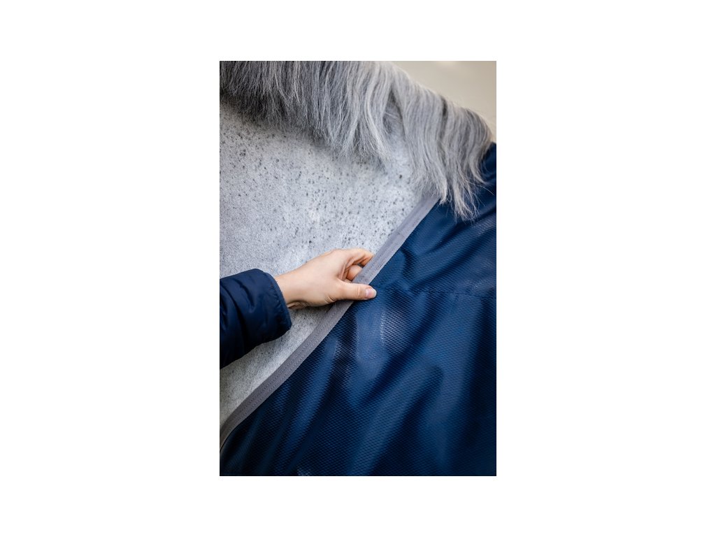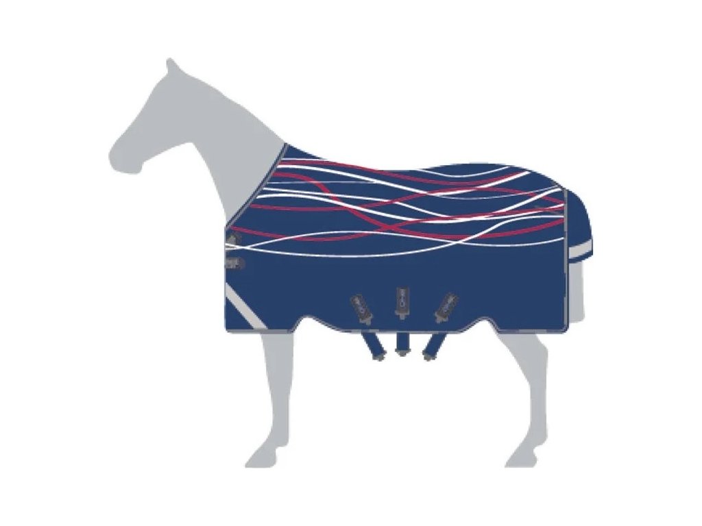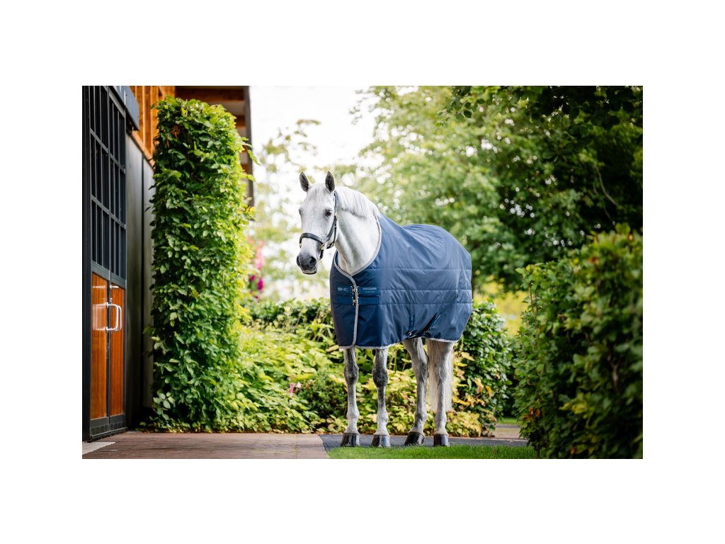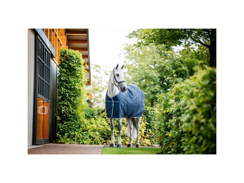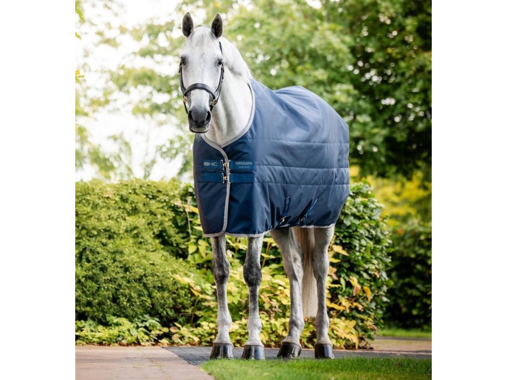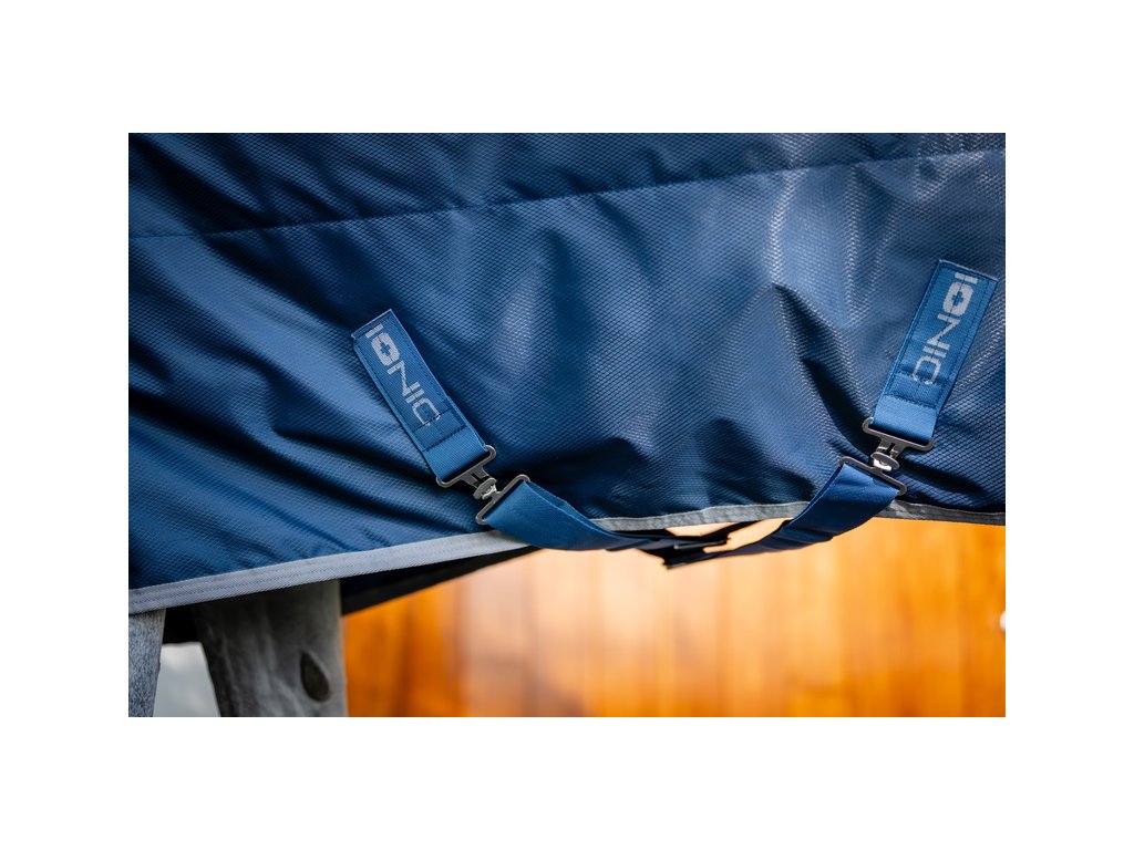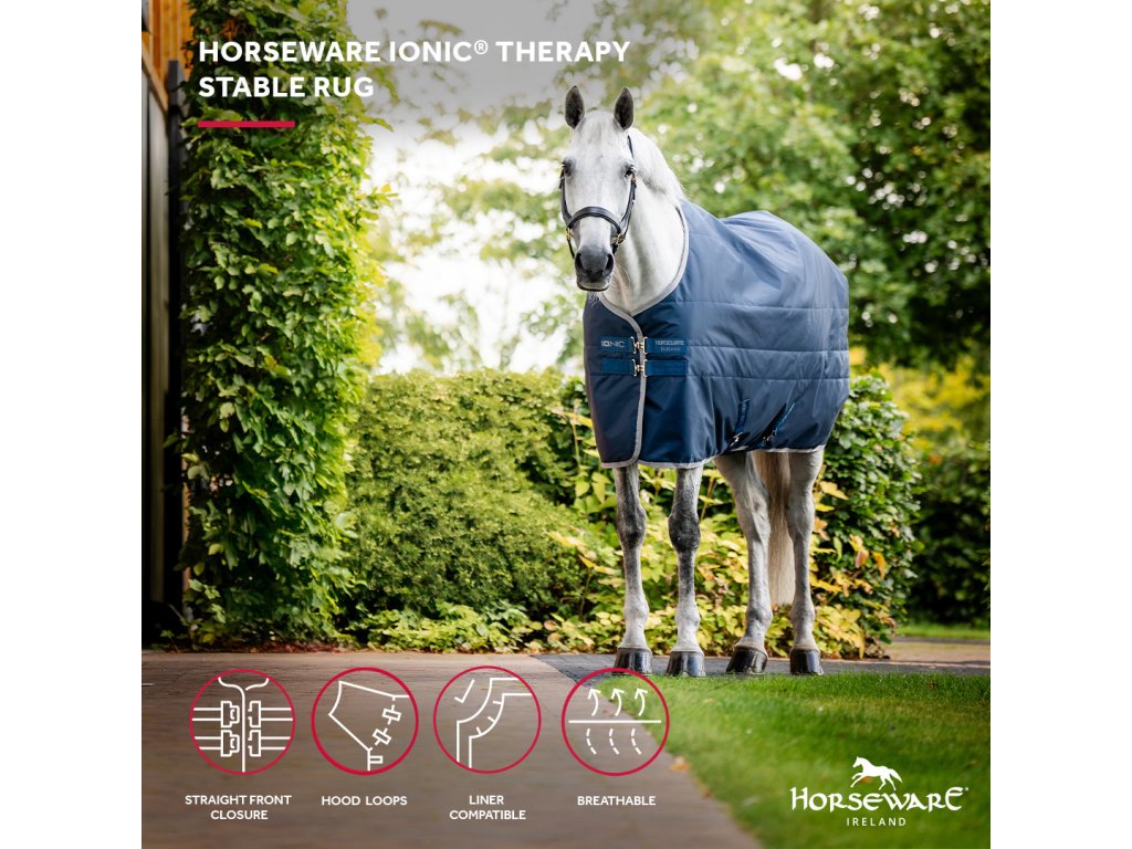 Terapeutyczna derka stajenna Ionic® Horseware 50g. Idealna dla koni stacjonujących w stajni lub na dłuższy pobyty w stajni. Wykonana z bardzo wytrzymałego poliestrowego materiału zewnętrznego typu diamond ripstop (wytrzymałość 210D), który zapewnia wytrzymałość, długą żywotność oraz utrzymuje konie suche i ciepłe. Wyściełana tkaniną z włókien ceramicznych, która odbija ciepło ciała w postaci promieniowania podczerwonego. Wyposażona w podwójne zapięcie z przodu, zapięcie krzyżowe na brzuchu i pasek na ogon. Element na szyję można kupić osobno. Kompatybilna z systemem liner.