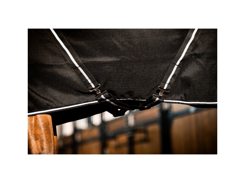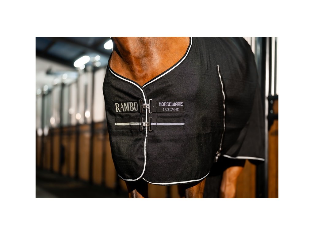 Wysokiej jakości derka stajenna Rambo bez ocieplenia (0 g). Wykonana z bardzo wytrzymałego materiału poliestrowego (wytrzymałość 1000D). Mimo klasycznego kroju i designu, na pierwszy rzut oka może wydawać się zwykłą derką stajenną, jednak jej sekret tkwi w miękkiej wyściółce z mikrofibry, która zapewnia Twojemu koniowi optymalne ciepło i komfort. Derka wyposażona jest w podwójne zapięcie z przodu, zapięcie krzyżowe pod brzuchem i pasek na ogon. Chroni również przed brudem i idealnie nadaje się do użytku w stajni lub podczas podróży.