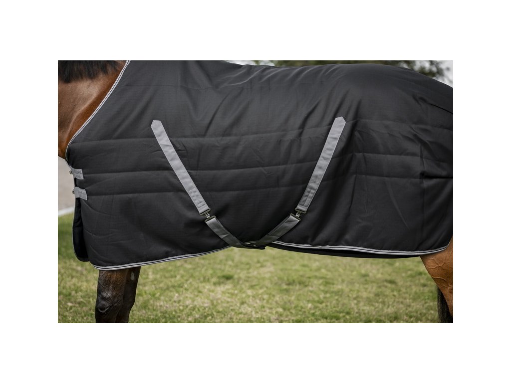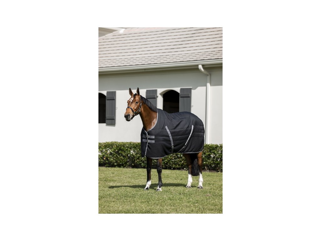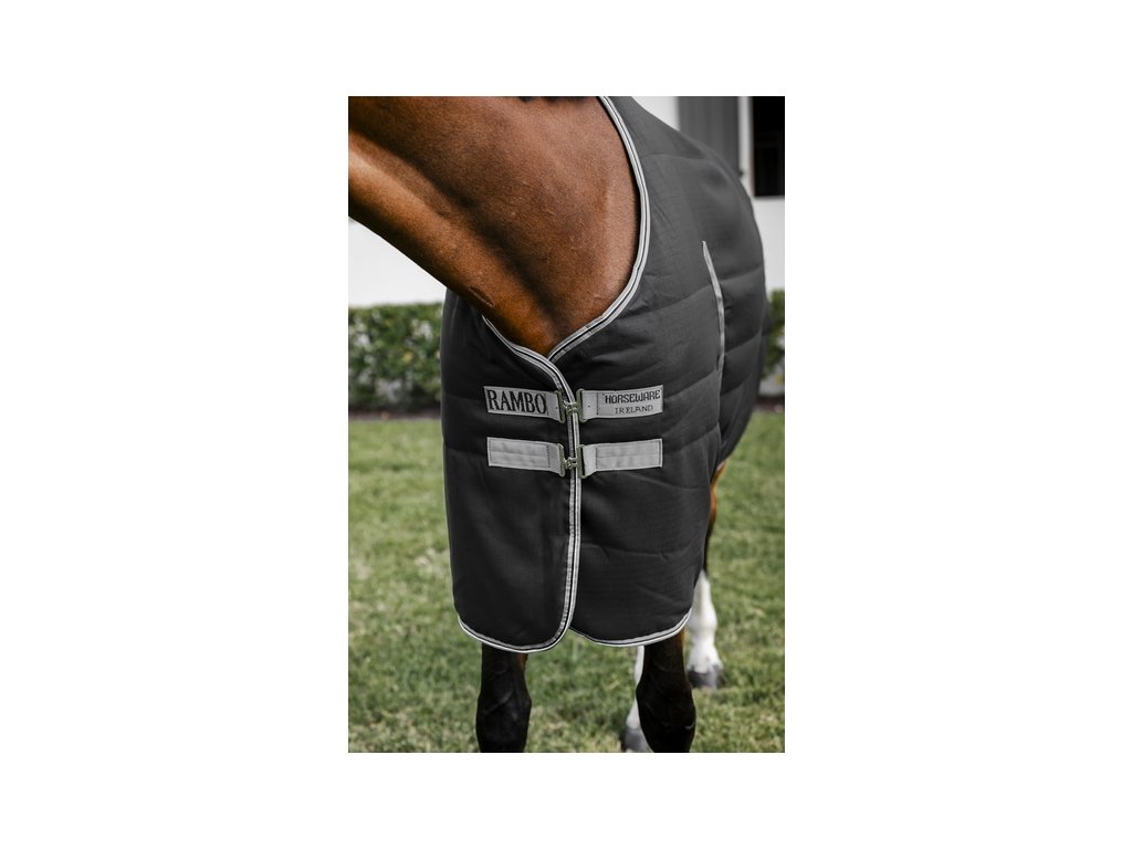 Bardzo popularna i najlepiej sprzedająca się derka stajenna Rambo z ociepleniem 200g, która niezawodnie wytrzymuje nawet mroźną pogodę i zapewnia koniowi ciepło i komfort nawet w najzimniejsze dni. Wykonana z mocnego i bardzo wytrzymałego materiału zewnętrznego Ripstop poliester (wytrzymałość 1000D). Gładka podszewka z mikrofibry pochłania wilgoć, zapewnia doskonałe warunki termiczne i chroni sierść przed otarciami. Pod podszewką znajduje się 400 g wypełnienia z włókna Thermobonded, które zapewnia wyjątkowe ciepło i długotrwały komfort termiczny. Z przodu derka wyposażona jest w proste zapięcie na podwójną klamrę, które nie ogranicza ruchów, a także zapięcie krzyżowe pod brzuchem i pasek na ogon. Kompatybilna z systemem liner.