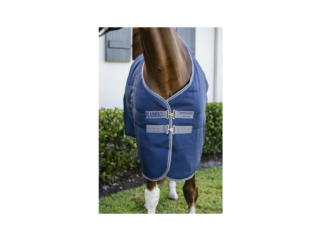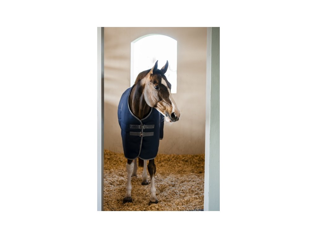 Bardzo popularna i najlepiej sprzedająca się derka stajenna Rambo z ociepleniem 400 g niezawodnie wytrzymuje nawet mroźną pogodę i zapewnia koniowi ciepło i komfort nawet w najzimniejsze dni. Wykonana z mocnego i bardzo wytrzymałego materiału zewnętrznego Ripstop poliester (wytrzymałość 1000D). Gładka podszewka z mikrofibry pochłania wilgoć, zapewnia doskonałe warunki termiczne i chroni sierść przed otarciami. Pod podszewką znajduje się 400 g wypełnienia z włókna Thermobonded, które zapewnia wyjątkowe ciepło i długotrwały komfort termiczny. Z przodu derka wyposażona jest w proste zapięcie na podwójną klamrę, które nie ogranicza ruchów, a także zapięcie krzyżowe pod brzuchem i pasek na ogon. Kompatybilna z systemem liner.