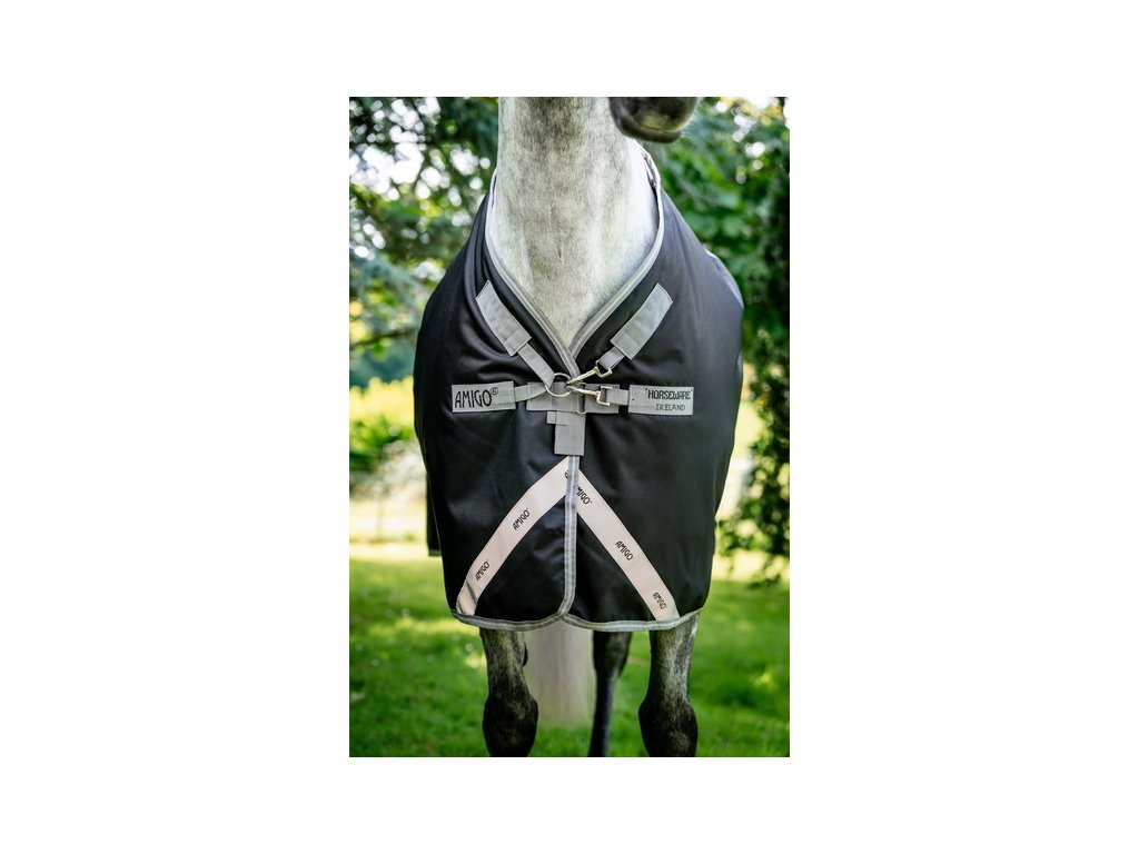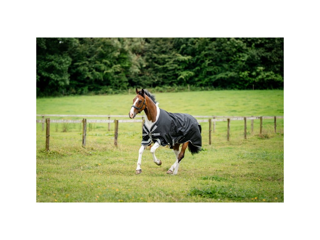 Wysokiej jakości derka padokowa z ociepleniem (150 g), zaprojektowana specjalnie dla szerszych i bardziej umięśnionych koni. Posiada wydłużony krój ogólny i bardziej przestronne wycięcie wokół szyi. Derka ta nadaje się na zimne dni dzięki wypełnieniu "Thermobonded", które zapewnia komfort termiczny w zmieniających się warunkach pogodowych. Materiał zewnętrzny wykonany jest z bardzo wytrzymałego, wodoodpornego i oddychającego poliestru (wytrzymałość 1200D). Wyściółka z antybakteryjnej, antystatycznej podszewki poliestrowej, która chroni przed otarciami i poprawia połysk. Wyposażona w praktyczne przednie zapięcie w kształcie litery V, które eliminuje nacisk na łopatki i zapewnia większy komfort oraz swobodę ruchów. Wyposażona również w potrójne zapięcie krzyżowe pod brzuchem, pasek na ogon i osłonę ogona. Wyposażona w elementy odblaskowe dla większego bezpieczeństwa. Kompatybilna z systemem liner.