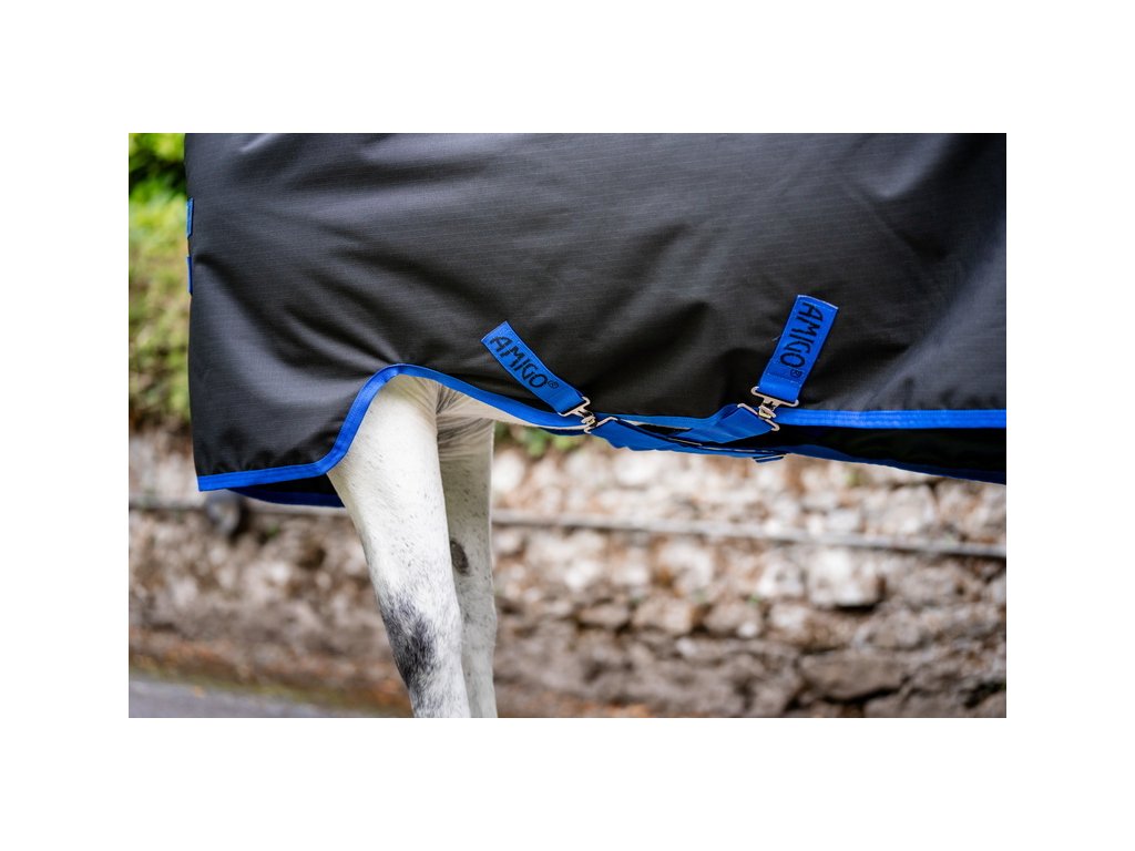 Wysokiej jakości derka Amigo dla kucyków z wypełnieniem 50 g. Wykonana z wodoodpornego, oddychającego i wytrzymałego materiału poliestrowego Rip-Stop (wytrzymałość 900D). Antystatyczna i antybakteryjna poliestrowa podszewka chroni przed obtarciami i zapewnia zdrową, lśniącą sierść. Wyposażona w podwójne zapięcie z przodu, krzyżowe zapięcie pod brzuchem, pas ogonowy i osłonę ogona. Anatomiczny krój w okolicy nóg zapewnia maksymalny komfort. Derka jest kompatybilna z systemem podpinek, a ochraniacz na szyję można dokupić osobno.