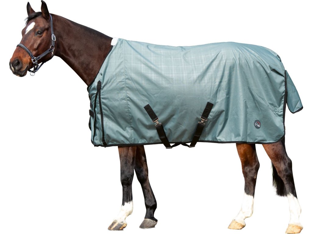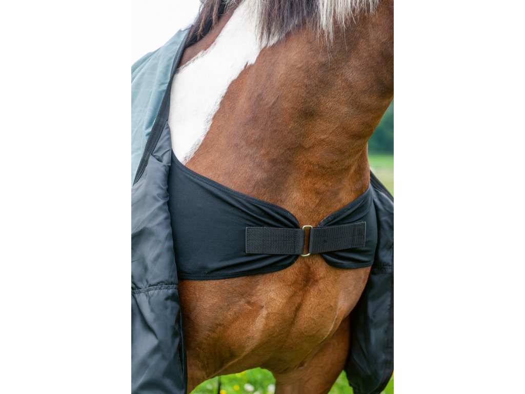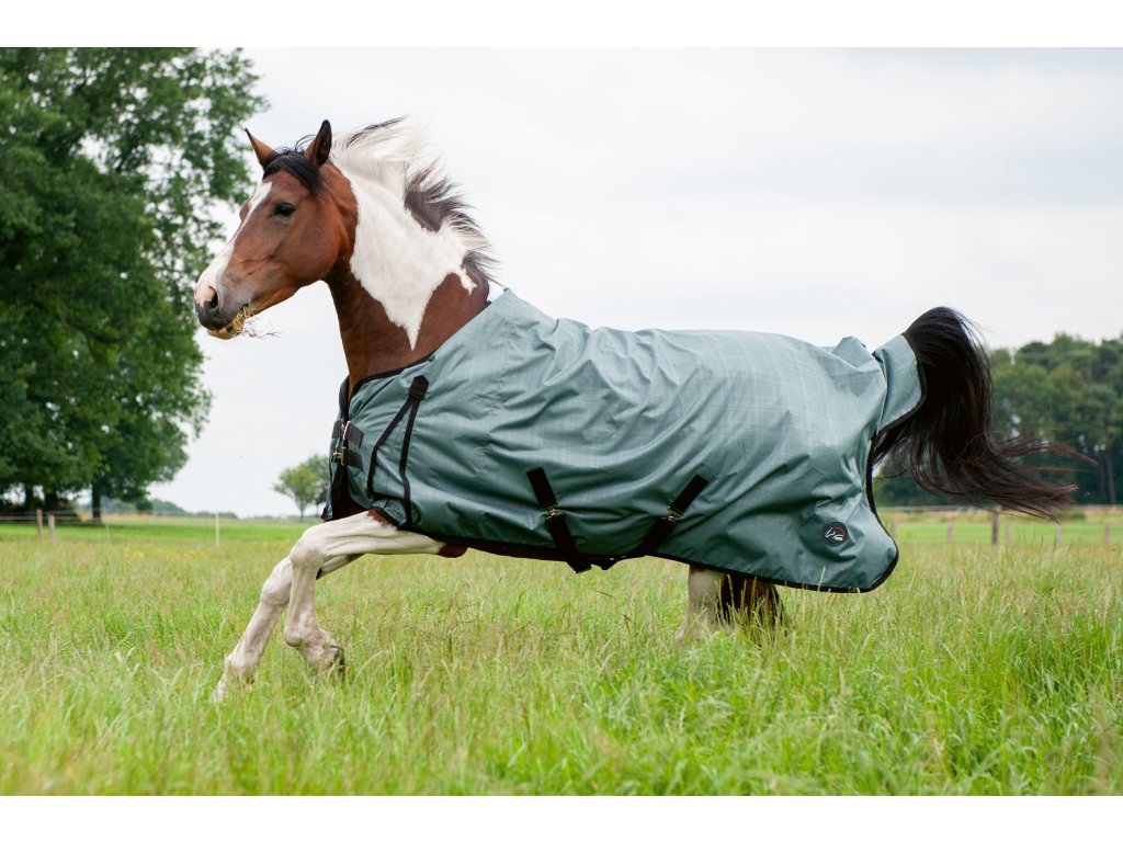 Wysokiej jakości, bardzo ciepła derka padokowa z 300g bawełnianym wypełnieniem i zintegrowanym zabezpieczeniem przed otarciami w okolicy klatki piersiowej, zapinana na rzep. Derka padokowa utrzymuje konia w cieple i suchości oraz chroni go przed nieprzyjemnym wiatrem. Wykonana z oddychającego, wiatroszczelnego i wodoodpornego materiału 3000 mm/m² (testowanego w Niemczech) i wytrzymałości 600D . Posiada podwójne zapięcie z przodu na klamry w kształcie litery T, zapięcie na krzyż pod brzuchem oraz elastyczne, odpinane paski między nogami. Wyposażona jest w klin na łopatce dla maksymalnej swobody ruchów, klapę na ogon i miękkie podszycie na kłębie, które zapobiega otarciom. Derkę można prać w pralce w temperaturze do 30°C i suszyć w suszarce bębnowej. Dostępna w wielu rozmiarach.