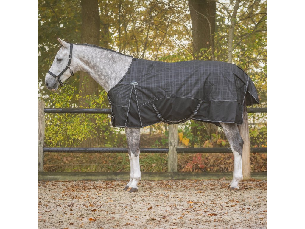 Bardzo wysokiej jakości derka padokowa z ociepleniem 50 g. Wykonana jest z mocnego, oddychającego i wodoodpornego materiału o wytrzymałości 1200 D i słupie wody 3000 mm/m², który utrzymuje konia w cieple i suchości nawet przy złej pogodzie. Derka jest wyposażona w podwójne zapięcie z przodu, krzyżowe zapięcie pod brzuchem z gumowymi końcówkami, paski między nogami i pasek pod ogonem. Konstrukcja derki obejmuje zakładki na łopatkach, miękki polar na kłębie i ochronę ogona. Dodatkowo w okolicy klatki piersiowej znajduje się nylonowa wkładka zapobiegająca otarciom. Dzięki przedłużonemu krojowi w okolicy klatki piersiowej derka jest również odpowiednia dla koni o szerszej budowie.