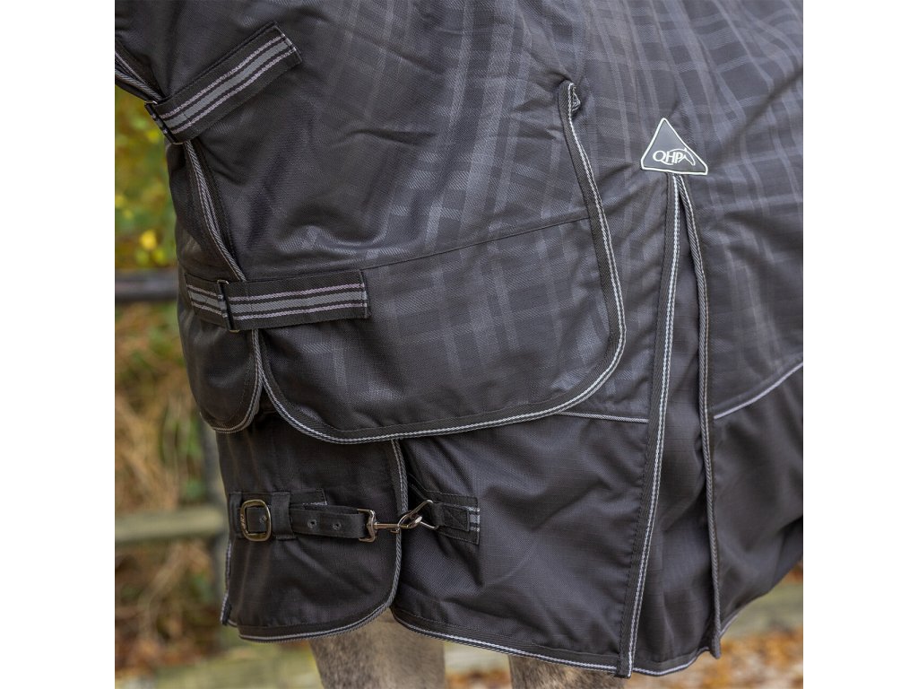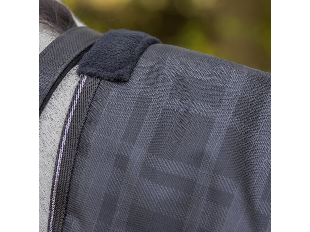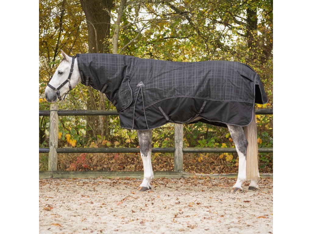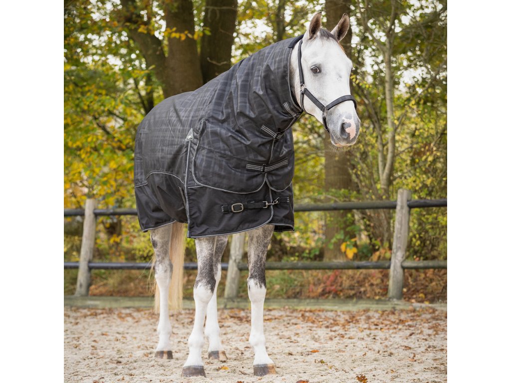 Bardzo wysokiej jakości derka padokowa z ociepleniem 300g i zintegrowaną częścią na szyję. Wykonana z mocnego, oddychającego i wodoodpornego materiału o wytrzymałości 1200 D i słupie wody 3000 mm/m², który zapewnia koniowi ciepło i suchość nawet podczas niekorzystnej pogody. Derka jest wyposażona w podwójne zapięcie z przodu, krzyżowe zapięcie pod brzuchem z gumowymi końcówkami, paski między nogami i pasek pod ogonem. Krój derki obejmuje zaszewki na łopatkach, miękki polar w okolicy kłębu i ochronę ogona. W okolicy klatki piersiowej znajduje się dodatkowa wstawka nylonowa, która zapobiega otarciom. Dzięki poszerzonemu krojowi w okolicy klatki piersiowej derka jest odpowiednia również dla szerszych koni.