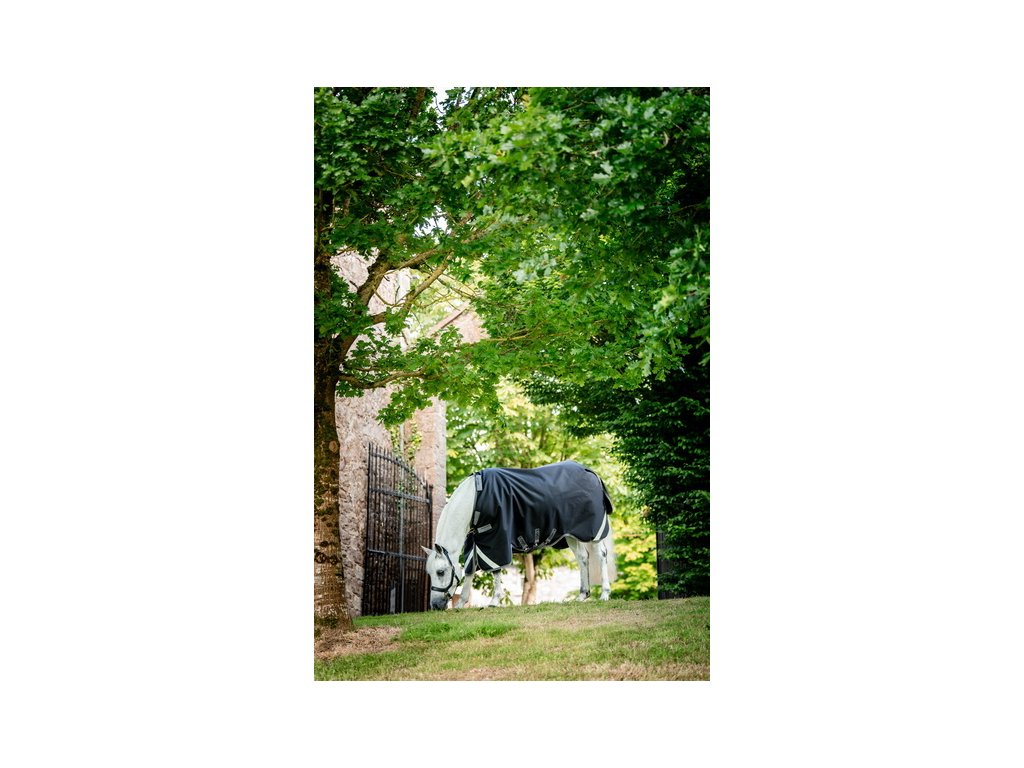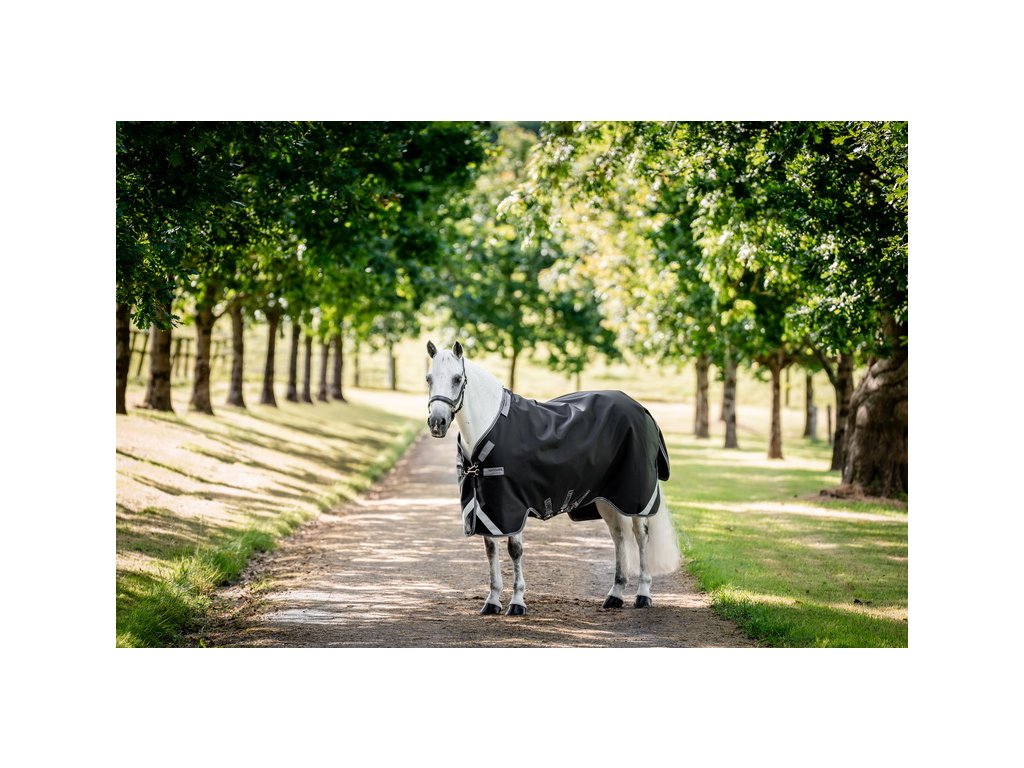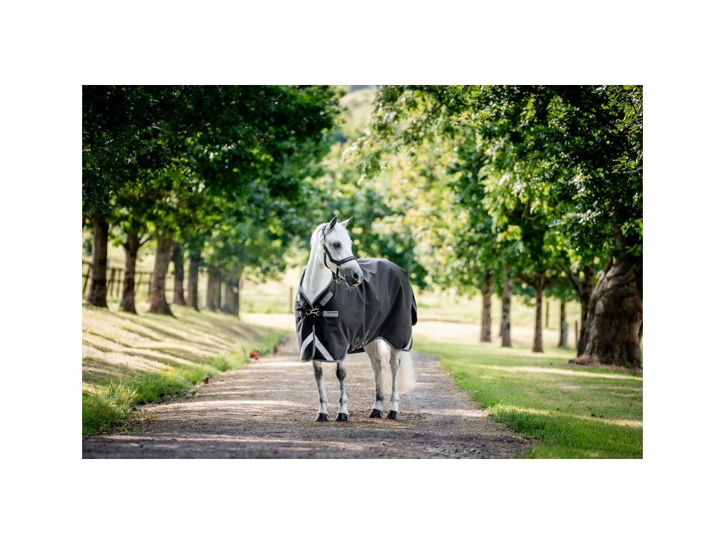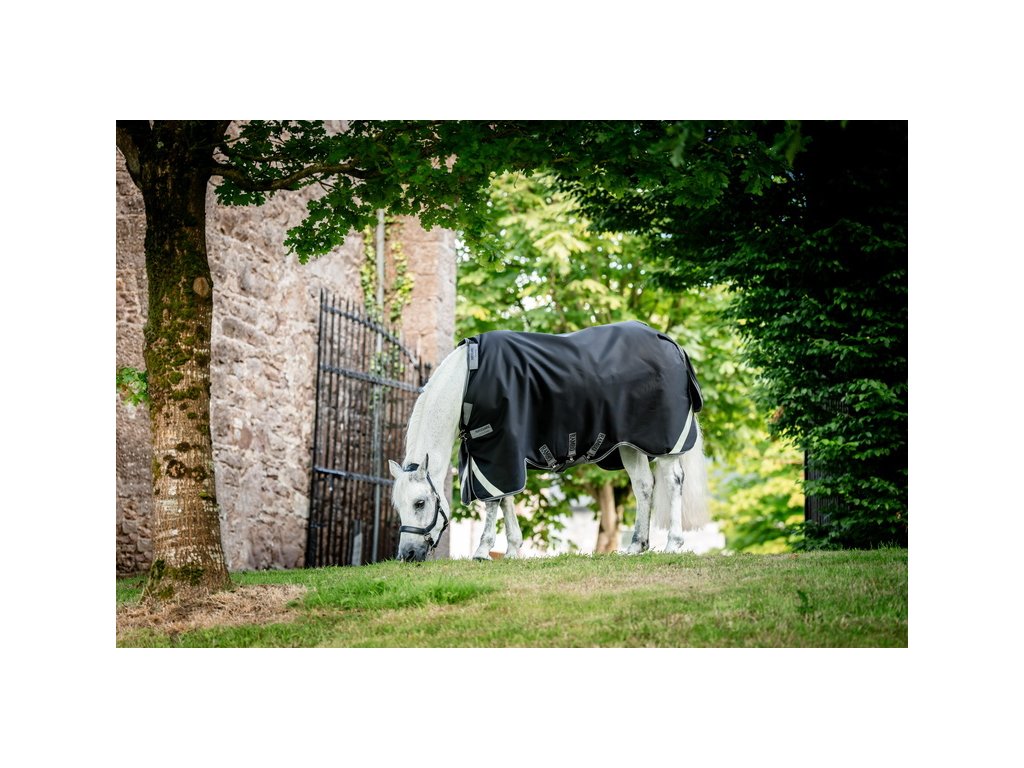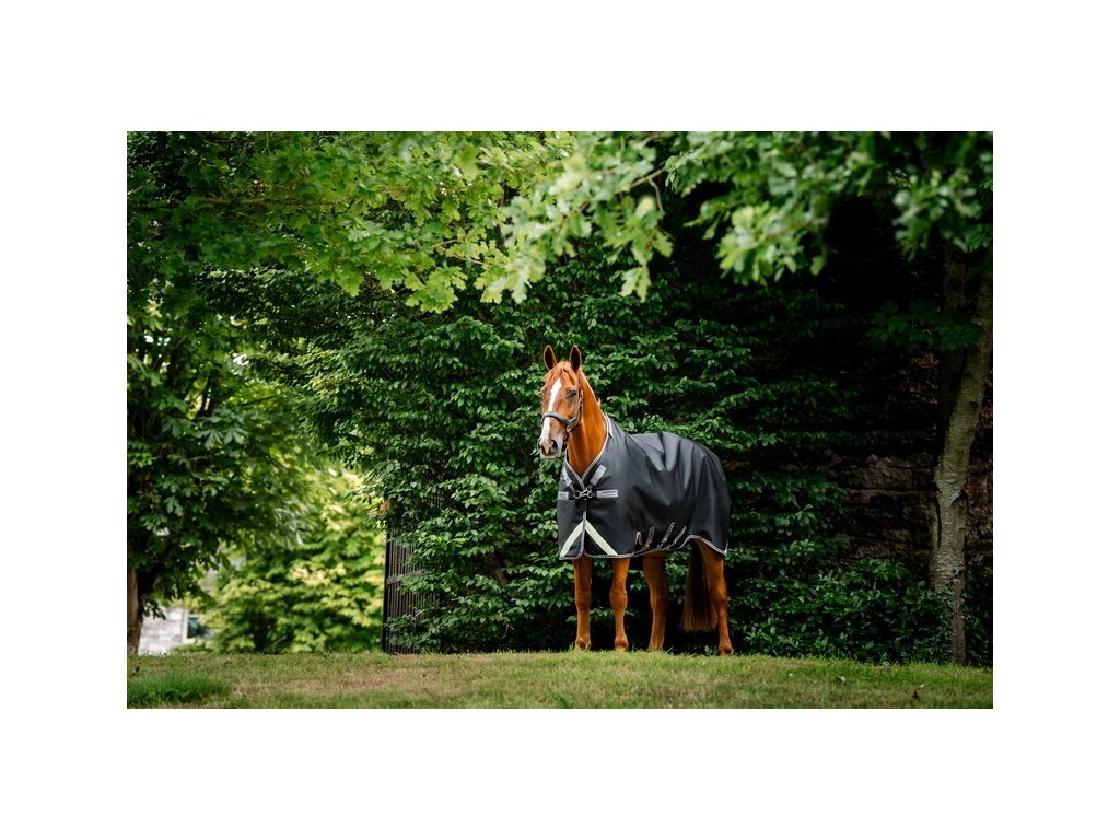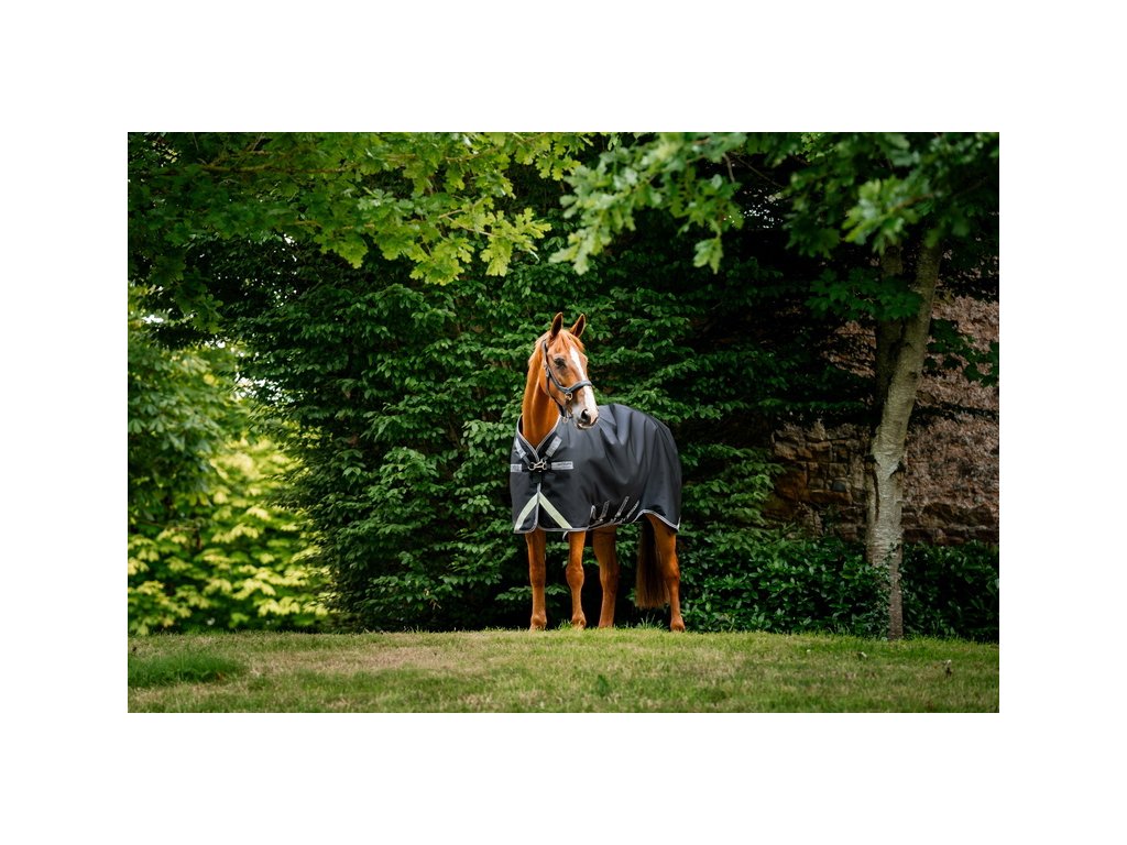 Wysokiej jakości wodoodporna derka padokowa z wypełnieniem 100 g. Wykonana z bardzo wytrzymałego nylonu balistycznego (wytrzymałość 1680 D), który jest wodoodporny i jednocześnie oddychający. Wyściółka z gładkiej podszewki poliestrowej, która jest delikatna dla skóry i chroni przed otarciami. Podszewka zapewnia również właściwości antybakteryjne i antystatyczne. Anatomiczny krój w okolicy nóg zapewnia maksymalny komfort. Posiada proste zapięcie w kształcie litery V, potrójne zapięcie na brzuch i pasek na ogon. Wyposażona w elementy odblaskowe dla większego bezpieczeństwa. Derka jest kompatybilna z systemem podpinek.
