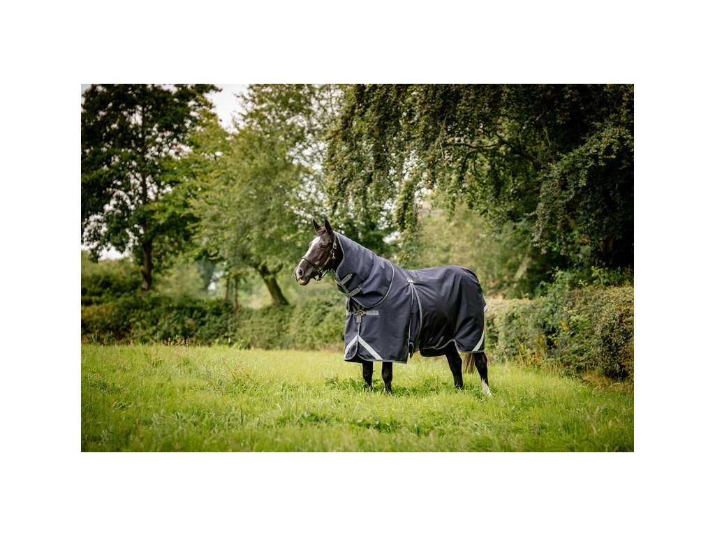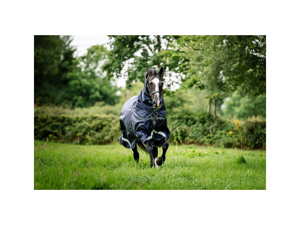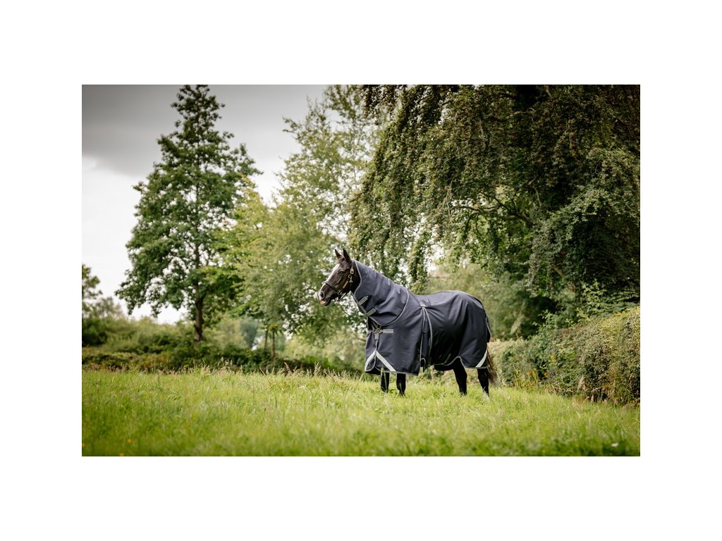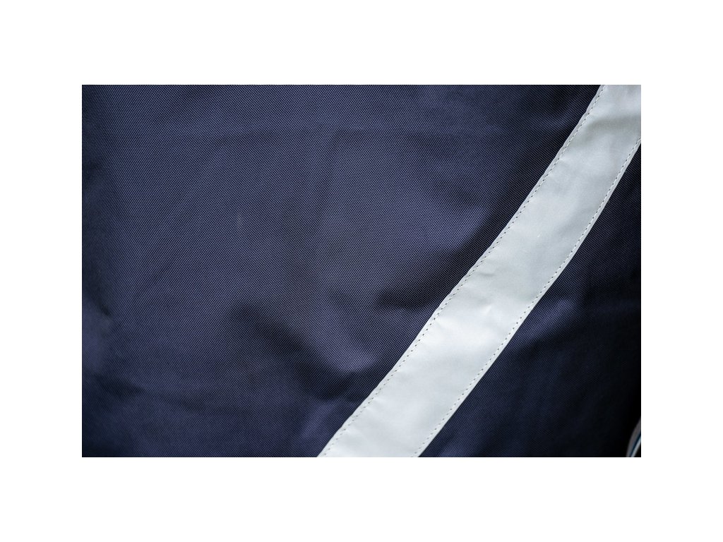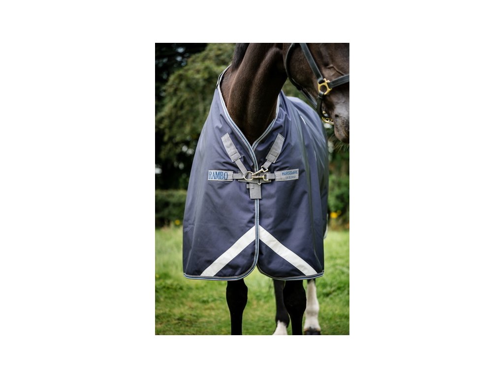 Wysokiej jakości derka padokowa Rambo Optimo komplet 2 w 1 , bez ocieplenia 0 g. W zestawie odpinany element na szyję bez ocieplenia 0 g i jeden liner z ociepleniem 200 g. Dzięki temu zestawowi można dopasować derkę do pogody, a w razie potrzeby można również dokupić dodatkowe podpinki Rambo Optimo. Specjalnie zaprojektowana dla koni o mocniejszej budowie. Dzięki technologii split, czyli rozcięciom, w które wyposażona jest derka, jest ona odpowiednia dla szerokich koni, a tym samym zapewnia maksymalną swobodę ruchów. Wykonana z najmocniejszego i najtrwalszego materiału na rynku – nylonu balistycznego, o wytrzymałości 1000D. Materiał jest wodoodporny i wysoce oddychający. Podszewka wykonana jest z gładkiego poliestru, który jest delikatny dla skóry i chroni przed otarciami, podszewka jest również antystatyczna i antybakteryjna. Derka posiada proste zapięcie na zatrzask w kształcie litery V z przodu, potrójne zapięcie krzyżowe pod brzuchem, pasek pod ogonem i osłonę ogona. Wyposażona w elementy odblaskowe dla większego bezpieczeństwa. Potrójne zapięcie na brzuch zawiera pasy bezpieczeństwa Rambo, które wytrzymują nacisk do 100 kg oraz plastikową klamrę, która zwalnia się w sytuacji awaryjnej, zapewniając dodatkową ochronę dla Twojego konia. Plastikowe klamry zamienne są dostępne do kupienia osobno.