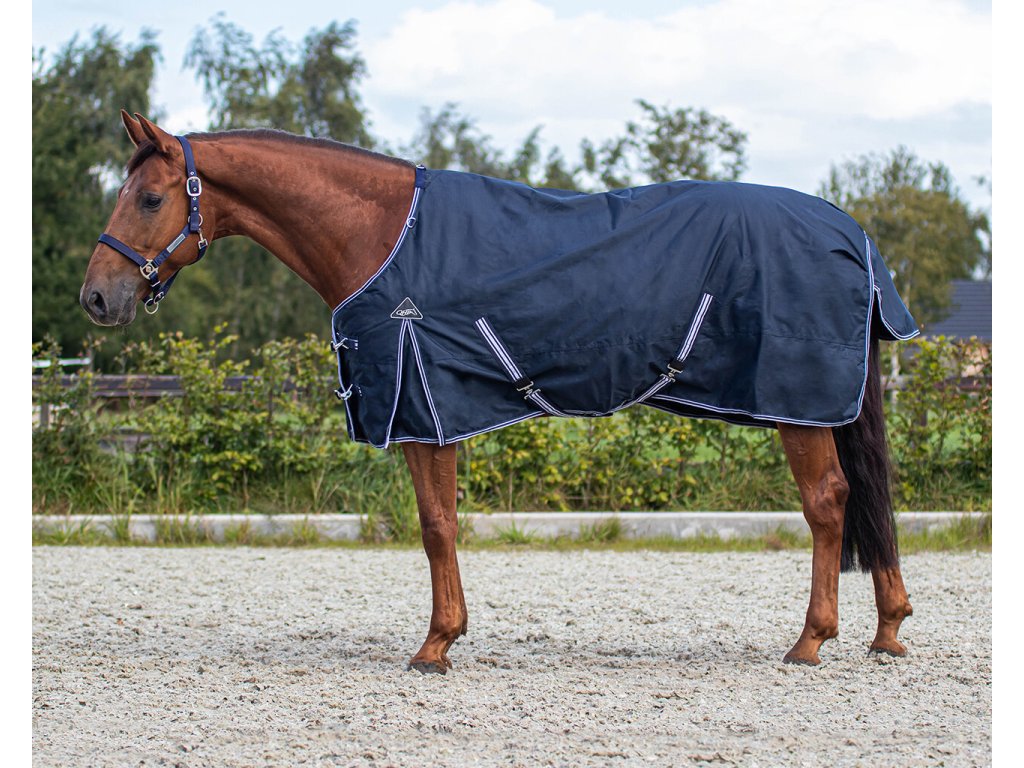 Wysokiej jakości derka padokowa z wypełnieniem termicznym 50 g/m². Derka utrzymuje konia w cieple i suchości oraz chroni go przed wiatrem. Wykonana jest z oddychającego, wiatroodpornego i wodoodpornego materiału 3000 mm/m². O wytrzymałości 600 D. Posiada podwójne zapięcie z przodu (Triplex) z klamrami i rzepem, krzyżowe zapięcia pod brzuchem z gumą oraz elastyczne paski między nogami. Wyposażona jest w klin zapewniający maksymalną swobodę ruchów, ochronę ogona, D-ringi do mocowania elementu szyjnego i miękki polar na kłębie, który zapobiega otarciom.