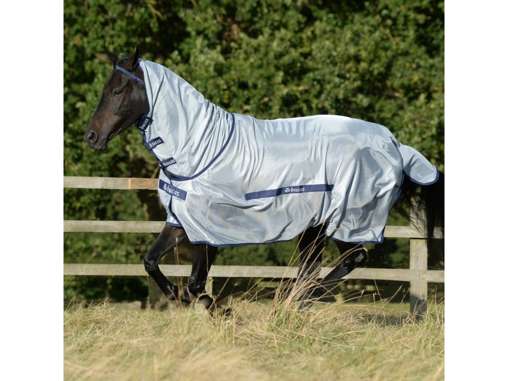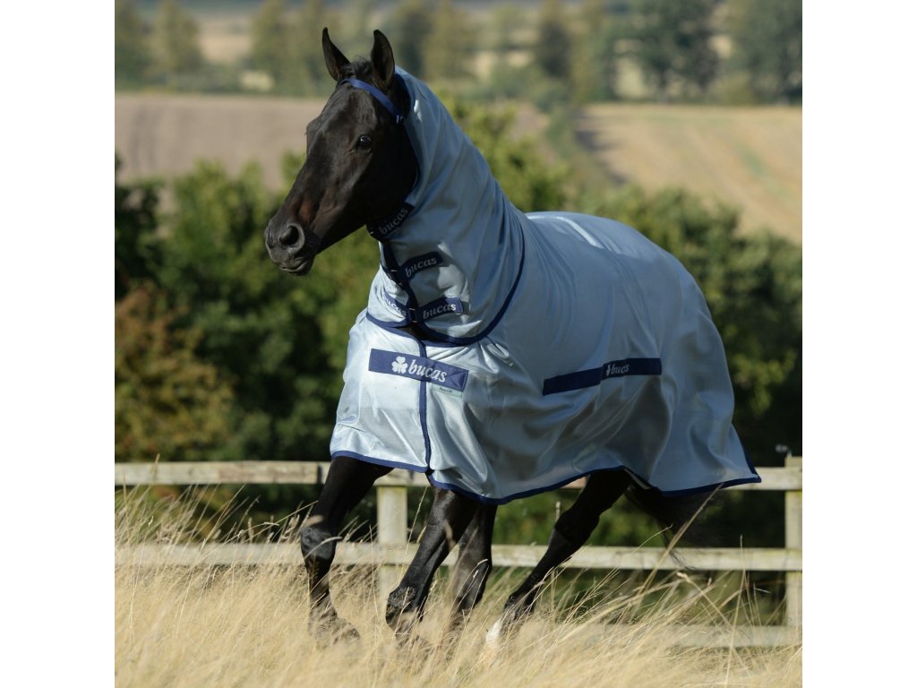 Producent Bucas prezentuje najpopularniejszy derkę przeciw owadom z kolekcji Buzz-Off, ten model Buzz-Off Full Neck jest wyposażony w zintegrowany element na szyję (nie można go odłączyć). Cała seria derek Buzz-Off jest wykonana ze specjalnej, lekkiej tkaniny siatkowej, która zapewnia skuteczną ochronę przed owadami i 75% ochronę przed promieniowaniem UV. Materiał siatkowy jest bardzo trwały, miękki i skutecznie odbija światło słoneczne. W okolicy łopatki i kłębu derka jest wyściełana specjalną jedwabną podszewką, która szczególnie chroni przed otarciami. Idealnie dopasowuje się dzięki marszczonemu materiałowi w okolicy łopatek. Z przodu znajduje się proste zapięcie typu T wraz z magnetycznym zatrzaskiem Snap-lock, a całość uzupełnia ochronny rzep. Również pełne zakrycie brzucha, pasek pod ogonem, paski na nogi i ochrona ogona. Elastyczna taśma przy uszach utrzymuje element na szyję na miejscu.