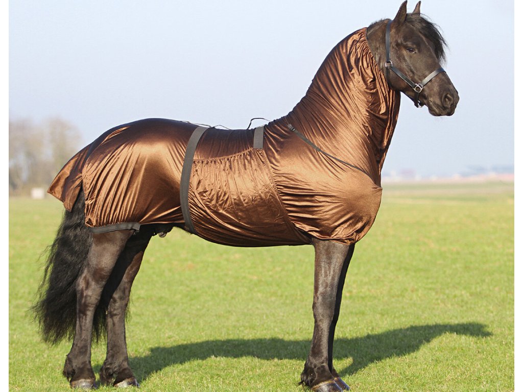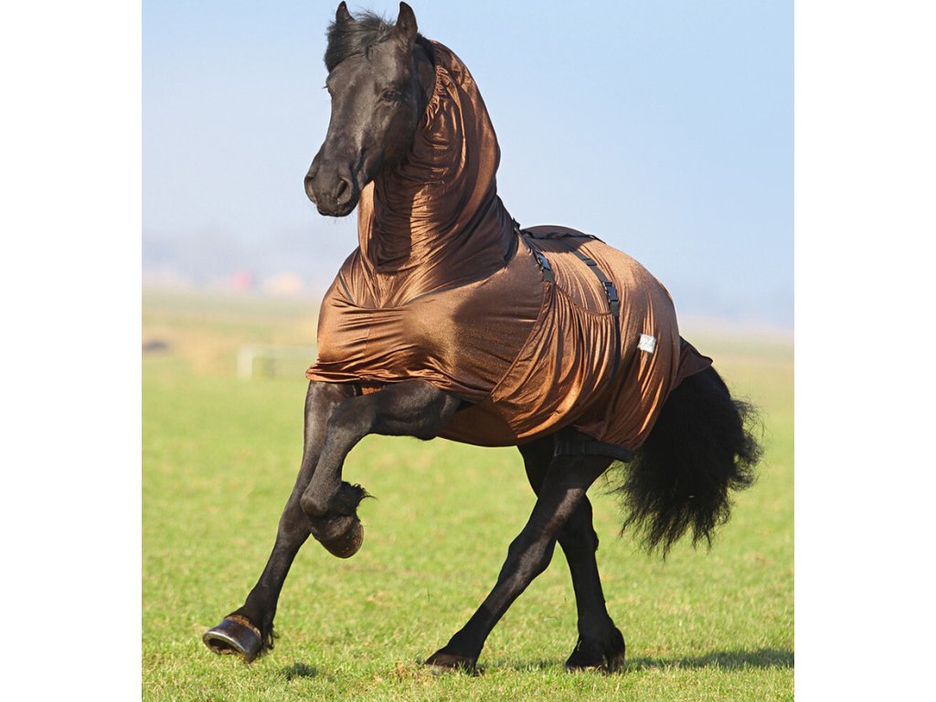 Ta ochronna derka jest przeznaczona przede wszystkim dla koni fryzyjskich i barokowych i jest wykonana z tkaniny poliestrowej o gramaturze 215 g/m2.Chroni konie przed owadami, zwłaszcza tymi, które mogą powodować reakcje alergiczne i swędzenie. Chroni również konia przed słońcem i promieniowaniem UV. Materiał jest mocny, elastyczny i oddychający. Wyposażona w elastyczną wstawkę w okolicy szyi, brzucha i nóg oraz bardzo dużą osłonę ogona.Można prać w pralce w temperaturze 30°C – zalecamy zapięcie wszystkich rzepów i przymocowanie karabińczyków. Prać w worku do prania. Nie używać płynu do zmiękczania tkanin i nie suszyć w suszarce bębnowej.