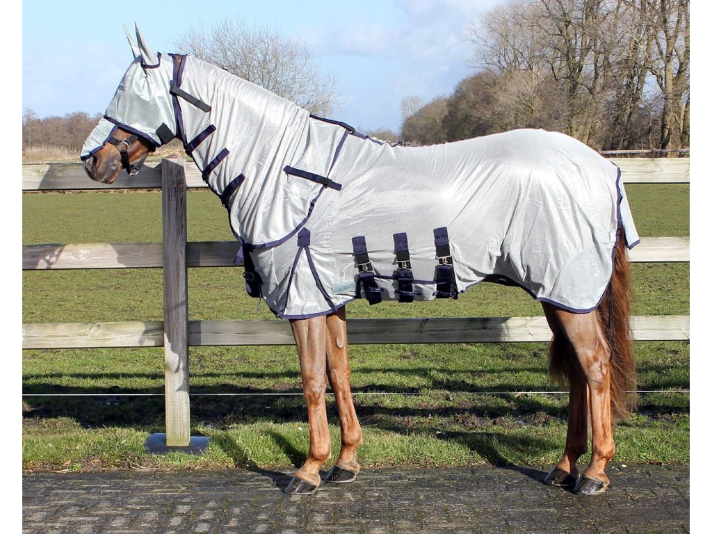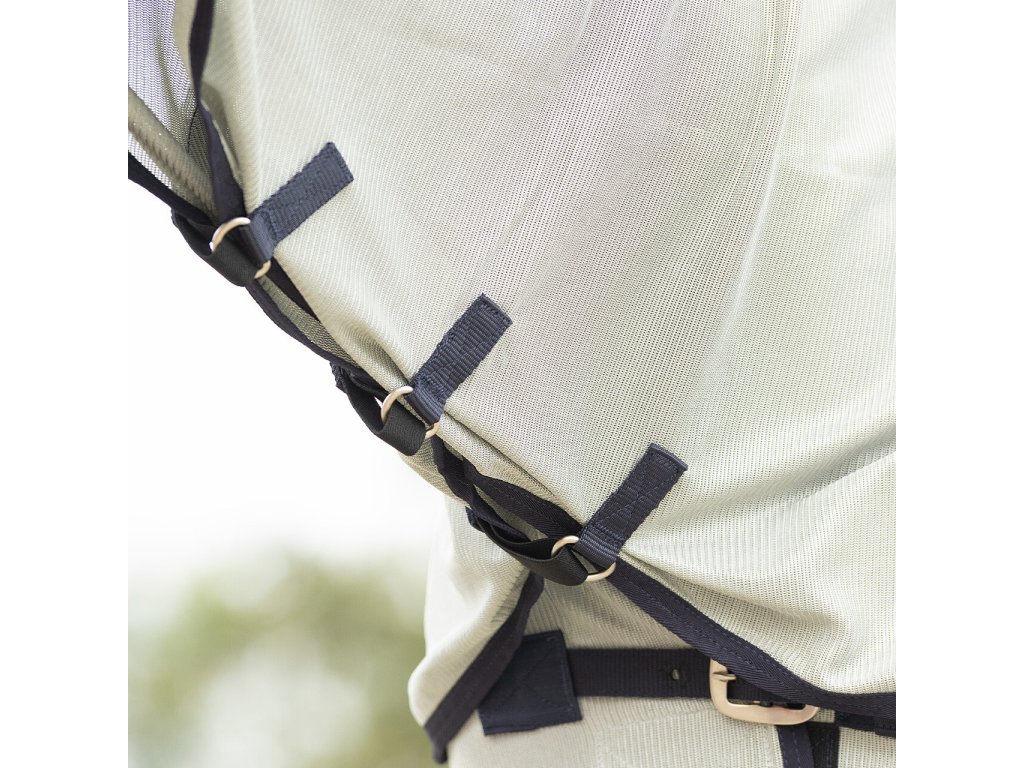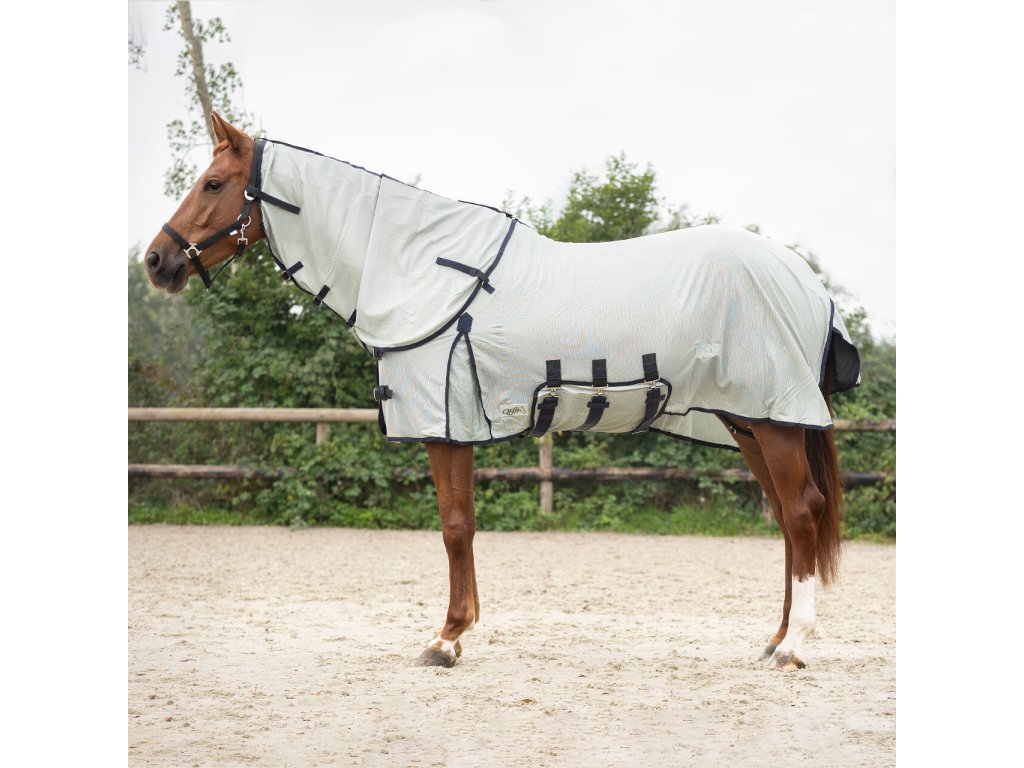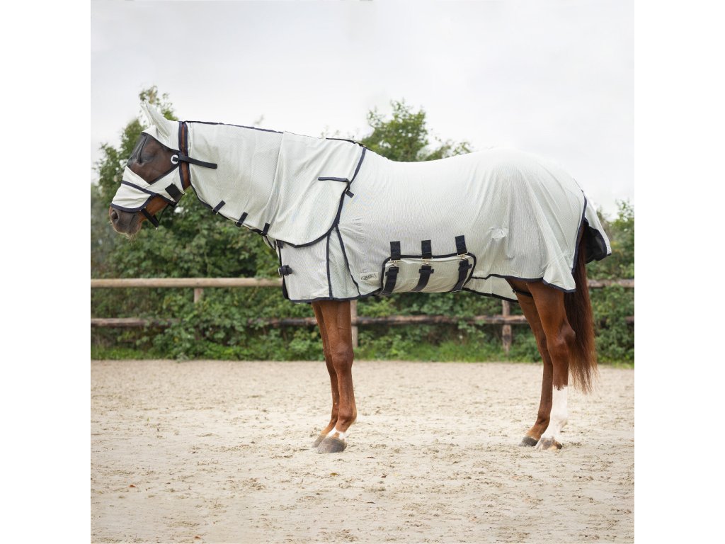 Oddychająca derka z siatki, zapobiega dostępowi owadów. Zawiera maskę, część na szyję i brzuch. Idealnie dopasowana, posiada część na brzuch z trzema paskami. Podwójne zapięcie z przodu z klamrą, kliny na ramionach, elastyczne paski między nogami i klapka na ogon.