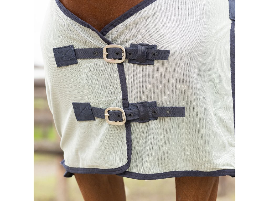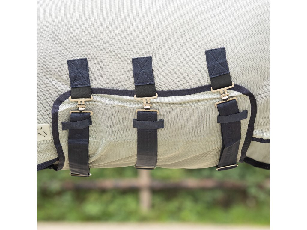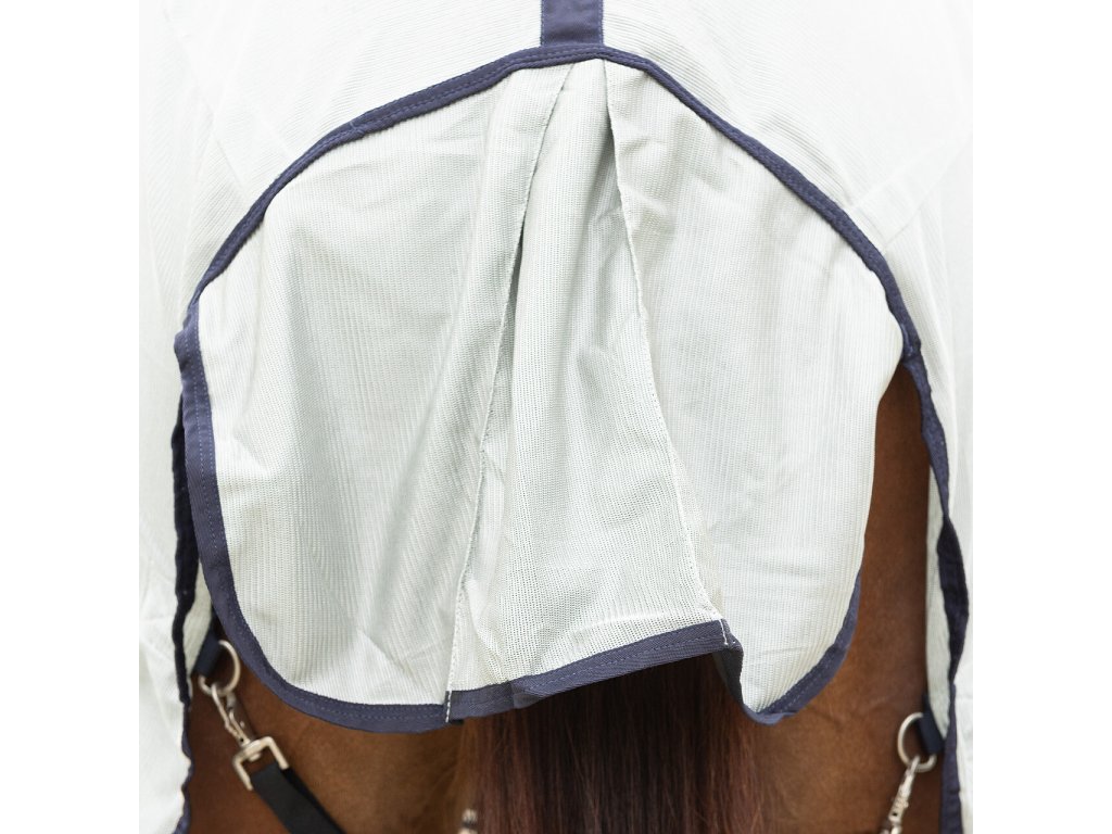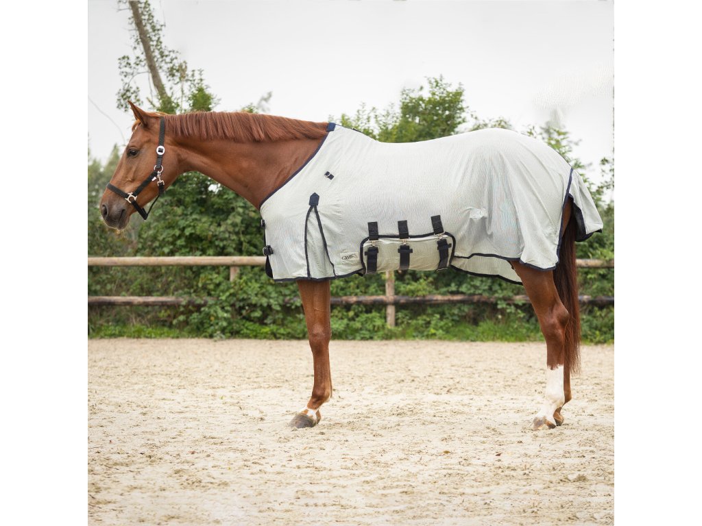Oddychająca derka z siatki, zapobiega dostępowi owadów. Zawiera maskę, część na szyję i brzuch. Idealnie dopasowana, posiada część na brzuch z trzema paskami. Podwójne zapięcie z przodu z klamrą, kliny na ramionach, elastyczne paski między nogami i klapka na ogon.