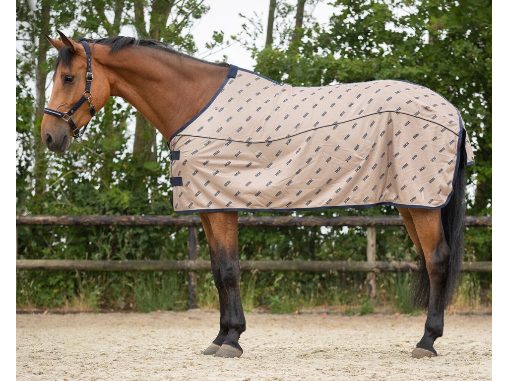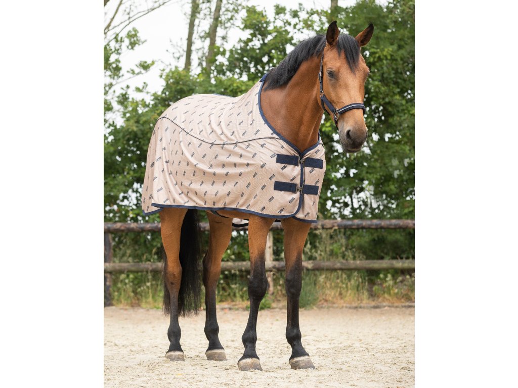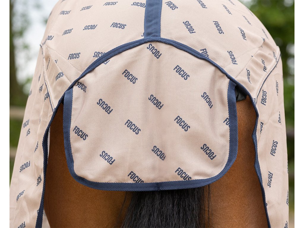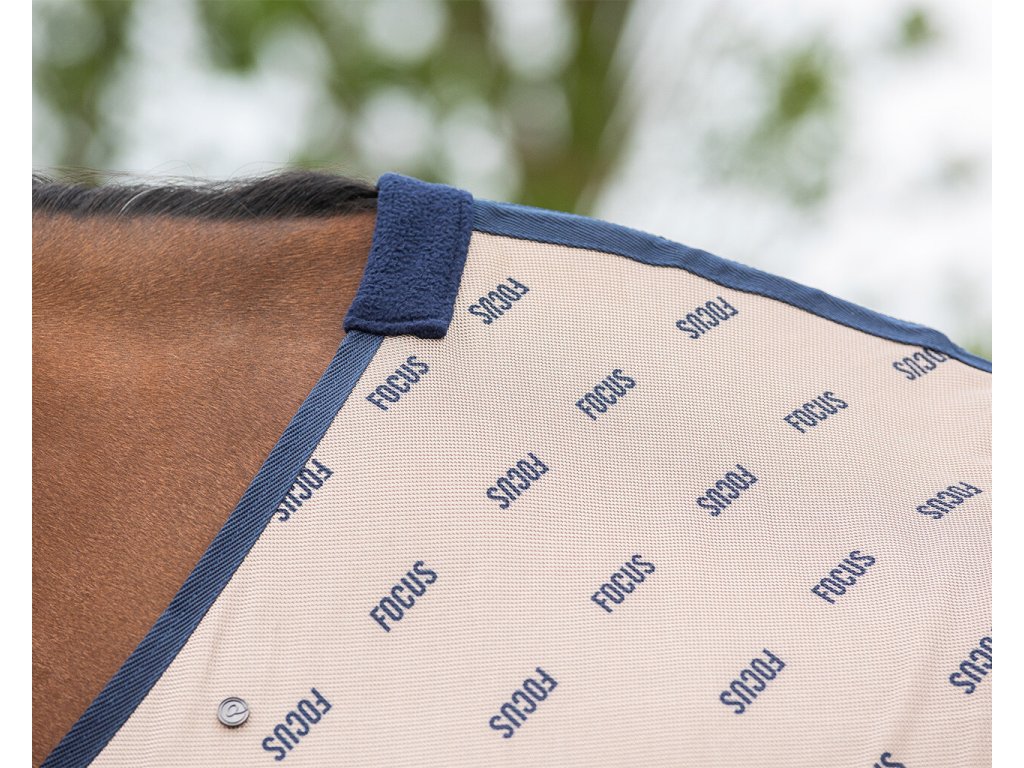 Wysokiej jakości derka letnia, która chroni konie przed uciążliwymi owadami. Wykonana z delikatnej tkaniny siatkowej, posiada nylonową wstawkę z przodu, która zapobiega otarciom. Wyposażona w podwójne zapięcie z przodu, krzyżowe zapięcie pod brzuchem z elastycznymi końcówkami i sznurek pod ogon. Derka oferuje również ochronę ogona, wkładkę polarową na kłębie i kliny na łopatkach dla maksymalnego komfortu. Ozdobiona motywem "Focus".