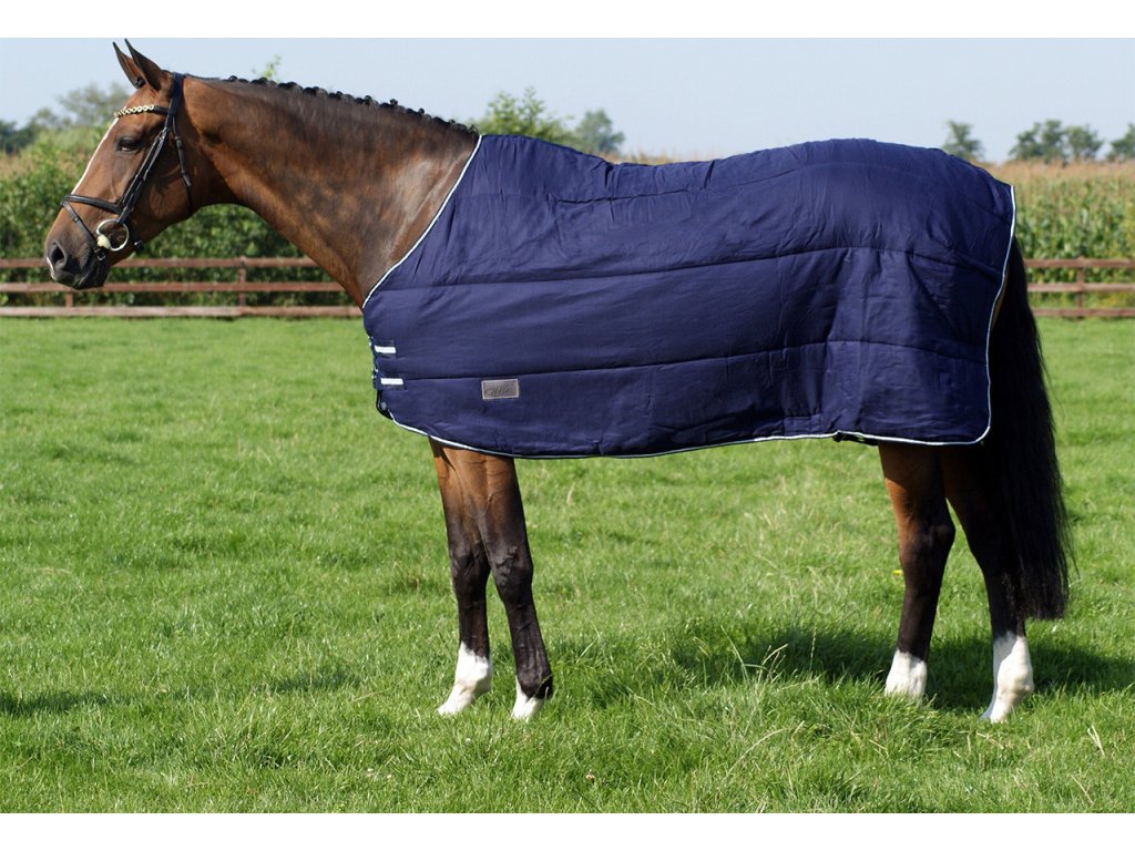 Granatowa derka idealna na chłodniejszą pogodę. Posiada ocieplenie termiczne 100 g/m² i podwójne zapięcie z przodu. Może być również używana jako derka spodnia. Dlatego jest lekko wycięta z przodu, aby zapobiec wystawaniu spod wierzchniej derki. Derka może być używana jako derka stajenna lub transportowa.