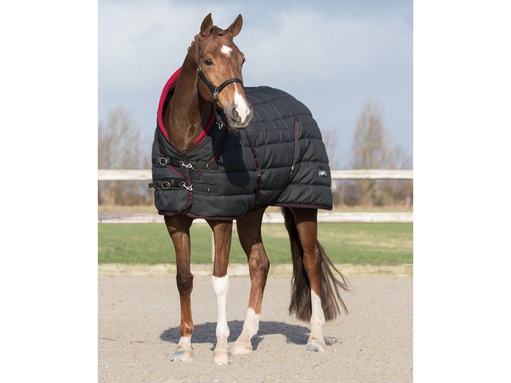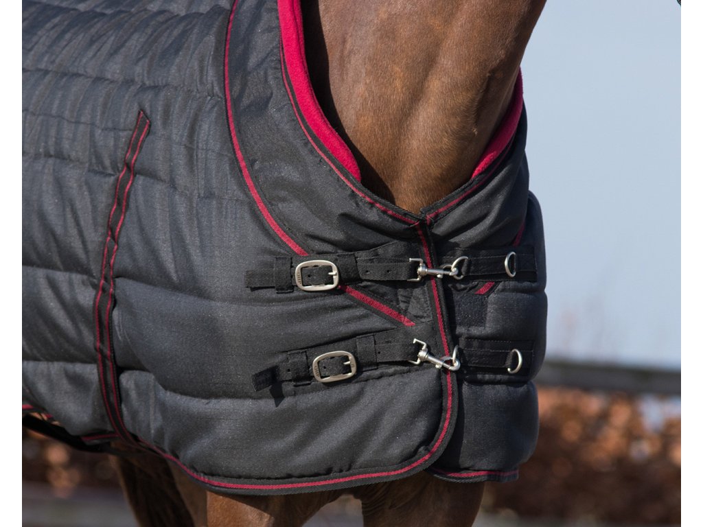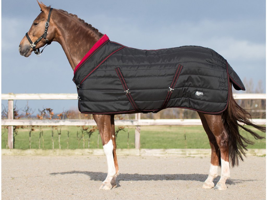 Derka stajenna z miękkim, polarowym kołnierzem i gładką podszewką. Kołnierz zapobiega obtarciom kłębu i zapewnia ciepło. Wypełnienie termiczne 200 g/m², wytrzymałość 1200 D.Derka posiada podwójne zapięcie z przodu (Triplex) z klamrami, krzyżowe zapięcie pod brzuchem, paski między nogami i ochronę ogona.