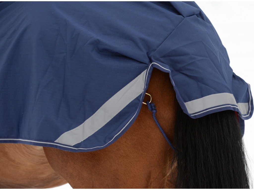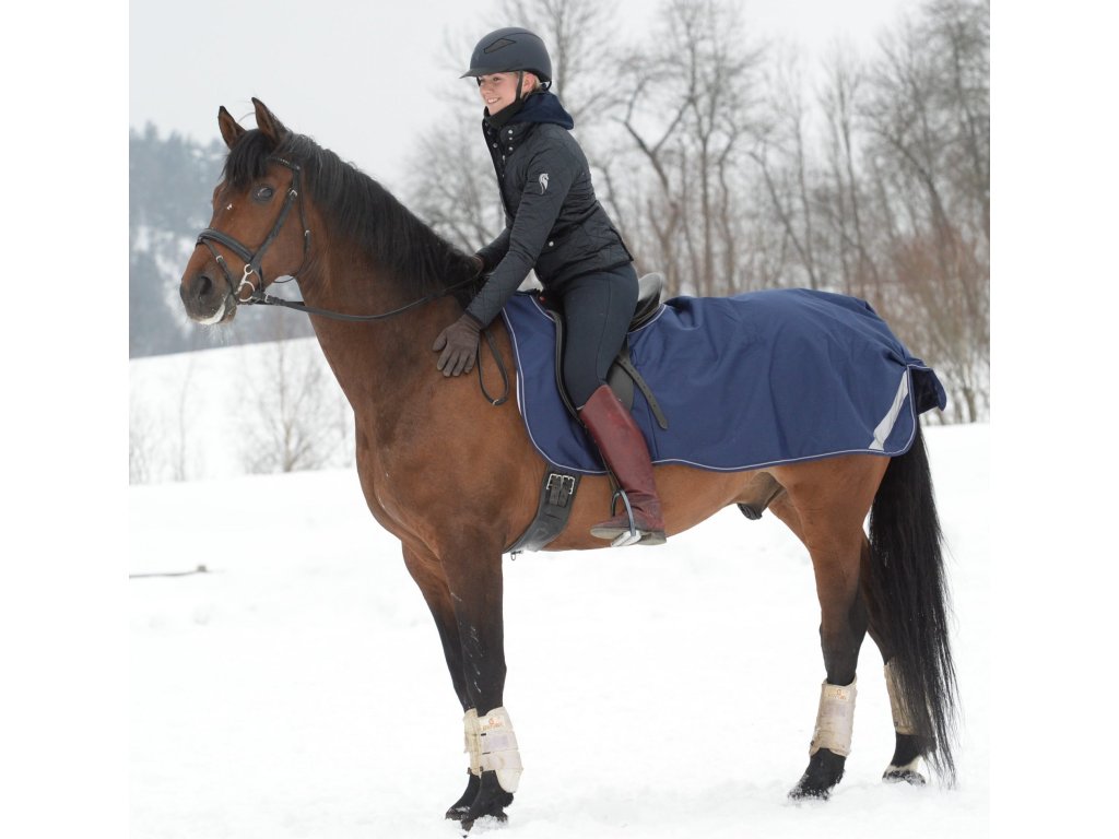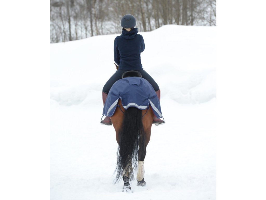 Wysoce praktyczna derka treningowa odpowiednia do jazdy w chłodne zimowe dni. Idealnie nadaje się również do użytku o zmierzchu lub w ciemności dzięki elementom odblaskowym, które zwiększają widoczność i bezpieczeństwo. Materiał zewnętrzny wykonany z wytrzymałego Rip-Stopu, który jest wodoodporny i wysoce oddychający. Wyściełana specjalną podszewką z polaru Stay dry, która bardzo szybko odprowadza wilgoć, zapewnia szybkie schnięcie sierści i pozostaje sucha. Antybakteryjna podszewka pomaga utrzymać derkę w dobrym stanie i przedłuża jej żywotność. Derkę bardzo łatwo zapiąć z przodu na rzep i nie ogranicza ona ruchów konia. Wyposażona również w ochronę ogona, w tym pasek pod ogonem.