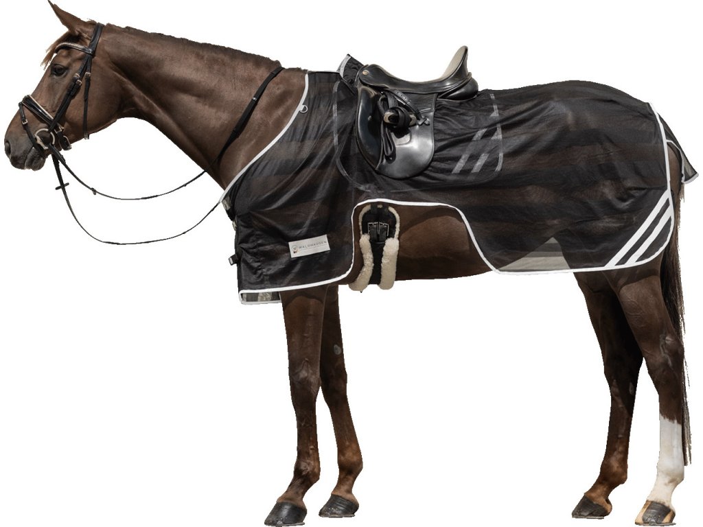 Odblaskowa derka treningowa ze srebrnymi fluorescencyjnymi paskami, idealna do jazdy konnej. Zwiększa widoczność w ciemności i w trudnych warunkach pogodowych, zapewniając większe bezpieczeństwo. Pojedyncze zapięcie z przodu, wycięcie wokół siodła dla komfortowej jazdy.