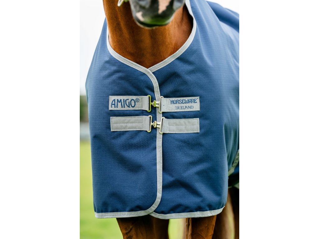 Wodoodporna derka padokowa Amigo bez ocieplenia 0 g, która nadaje się na przejściową pogodę. Wykonana z bardzo wytrzymałego materiału poliestrowego o gramaturze 900 D. Materiał jest wodoodporny, a także oddychający. Podszewka wykonana jest z gładkiego poliestru, który jest delikatny dla skóry i chroni przed otarciami. Podszewka jest również antystatyczna i antybakteryjna. Derka jest wyposażona w podwójne zapięcie z przodu, elastyczne zapięcie krzyżowe pod brzuchem i pasek pod ogonem. Anatomiczny krój w okolicy przedniej nogi zapewnia maksymalną swobodę ruchów. Element na szyję można zakupić osobno. Kompatybilna z systemem liner.