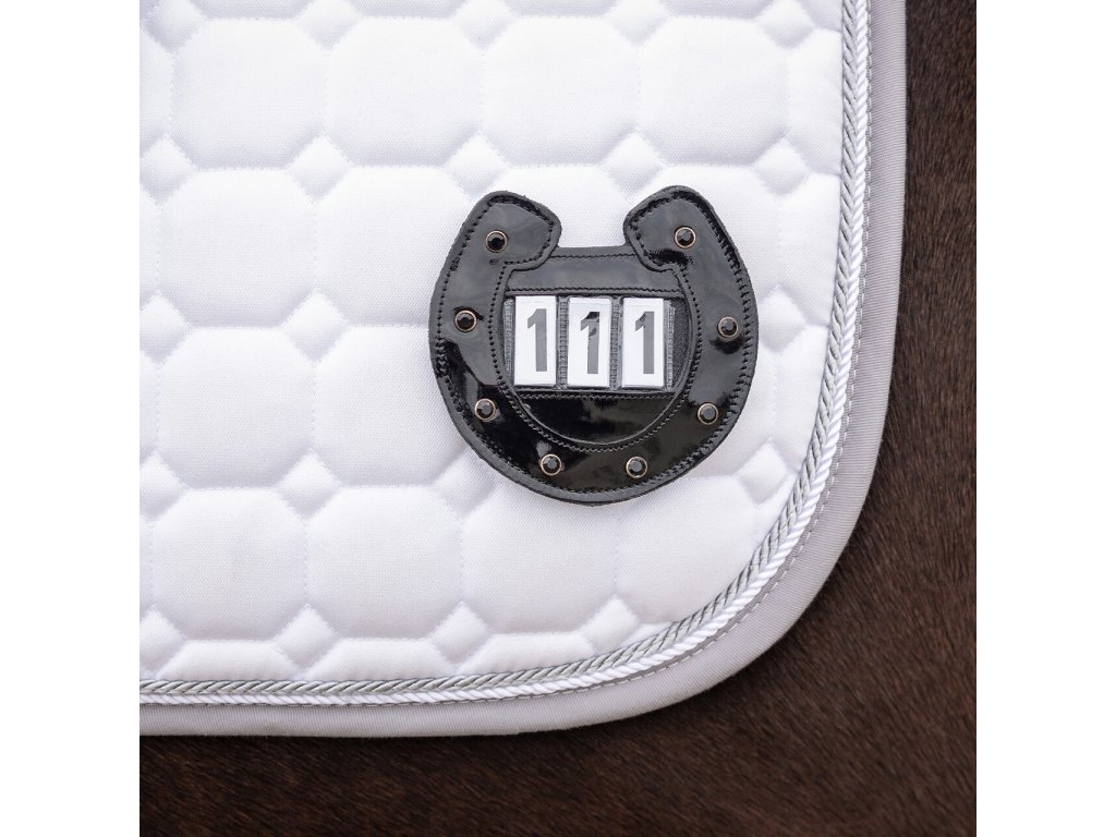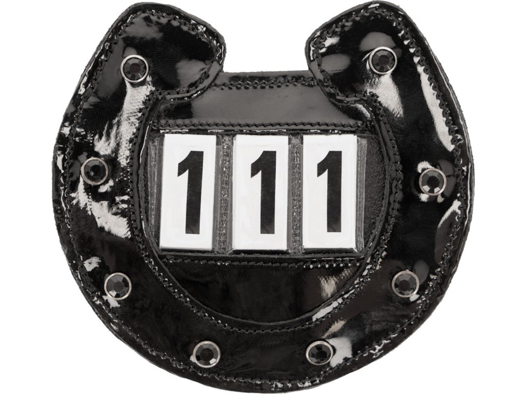 Trzycyfrowy uchwyt na numer startowy wykonany ze skóry lakierowanej, w kształcie podkowy i ozdobiony ciemnymi cyrkoniami. Dostarczany razem z wymiennymi numerami. Można go łatwo przymocować do czapraka lub ogłowia za pomocą rzepu i agrafki.