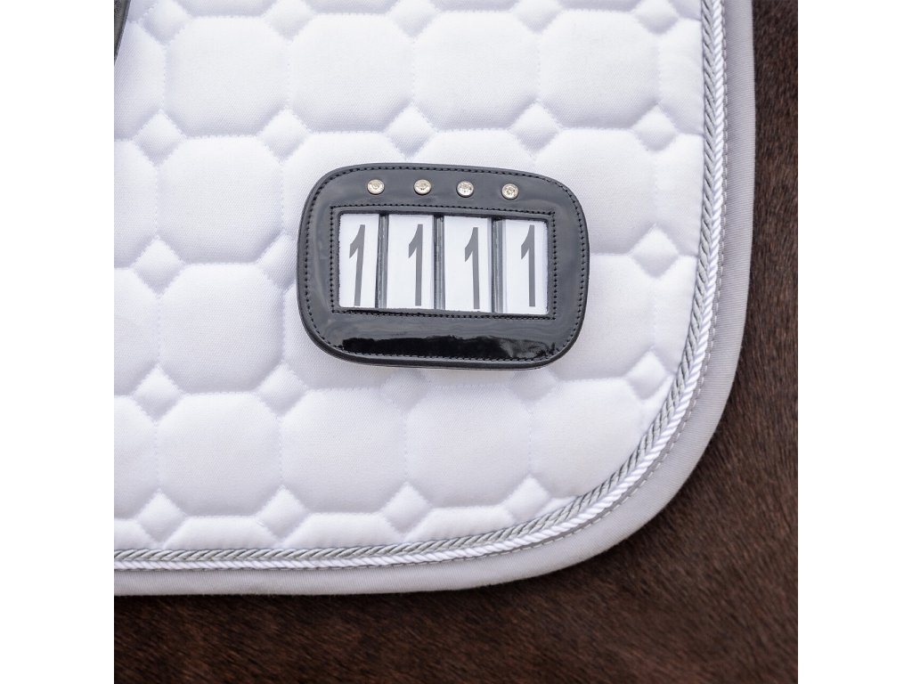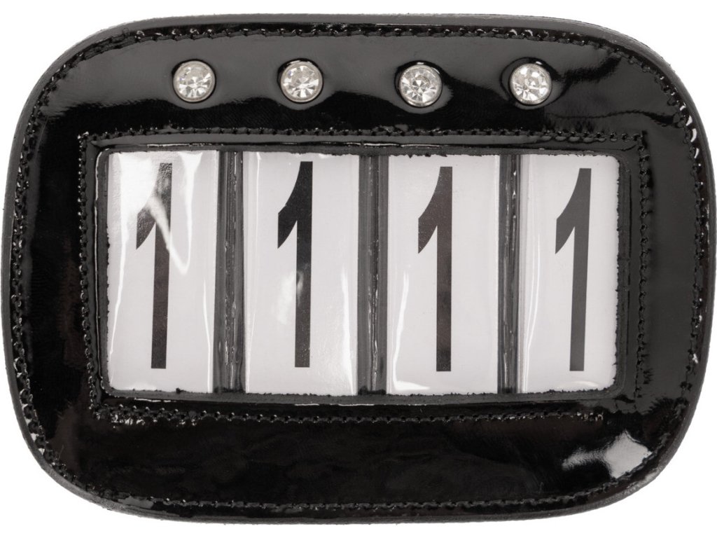 Czterocyfrowy uchwyt na numery startowe wykonany z wysokiej jakości skóry lakierowanej.Dostarczany razem z wymiennymi numerami. Można go łatwo przymocować do czapraka lub ogłowia za pomocą rzepu i agrafki. Zestaw zawiera 2 sztuki.