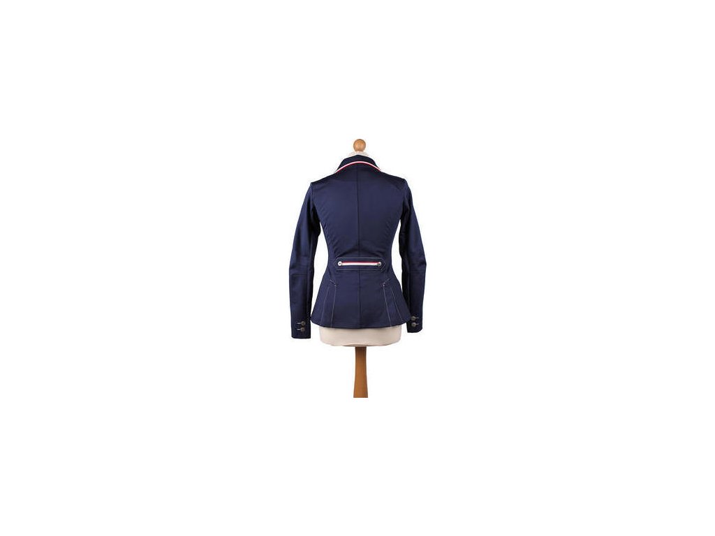 Elegancki frak konkursowy Coco od QHP z przyciągającymi wzrok detalami. Wykonany z lekko elastycznego materiału softshell. Frak jest również oddychający i bardzo wygodny. Podkreślony trójkolorowym motywem na kołnierzu, kieszeniach i plecach. Zapinany na guziki. Dostępny w trzech kolorach i rozmiarach damskich. Kask, krawat, nauszniki i czaprak są również dostępne w tym samym wzorze.
