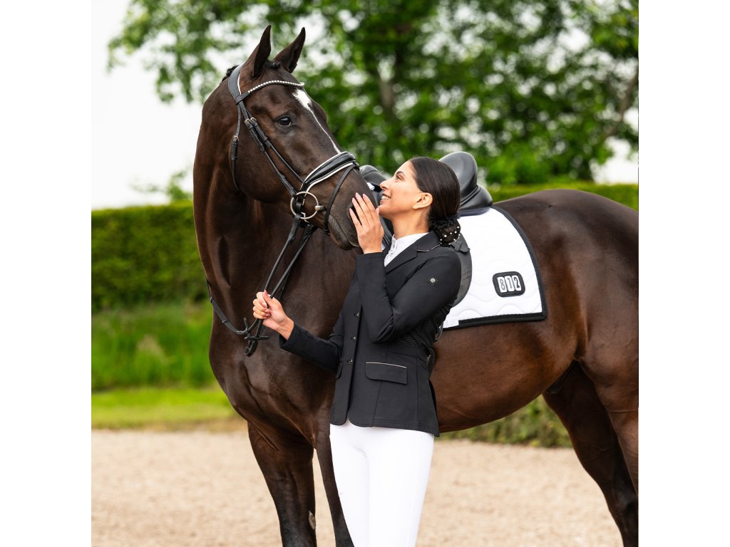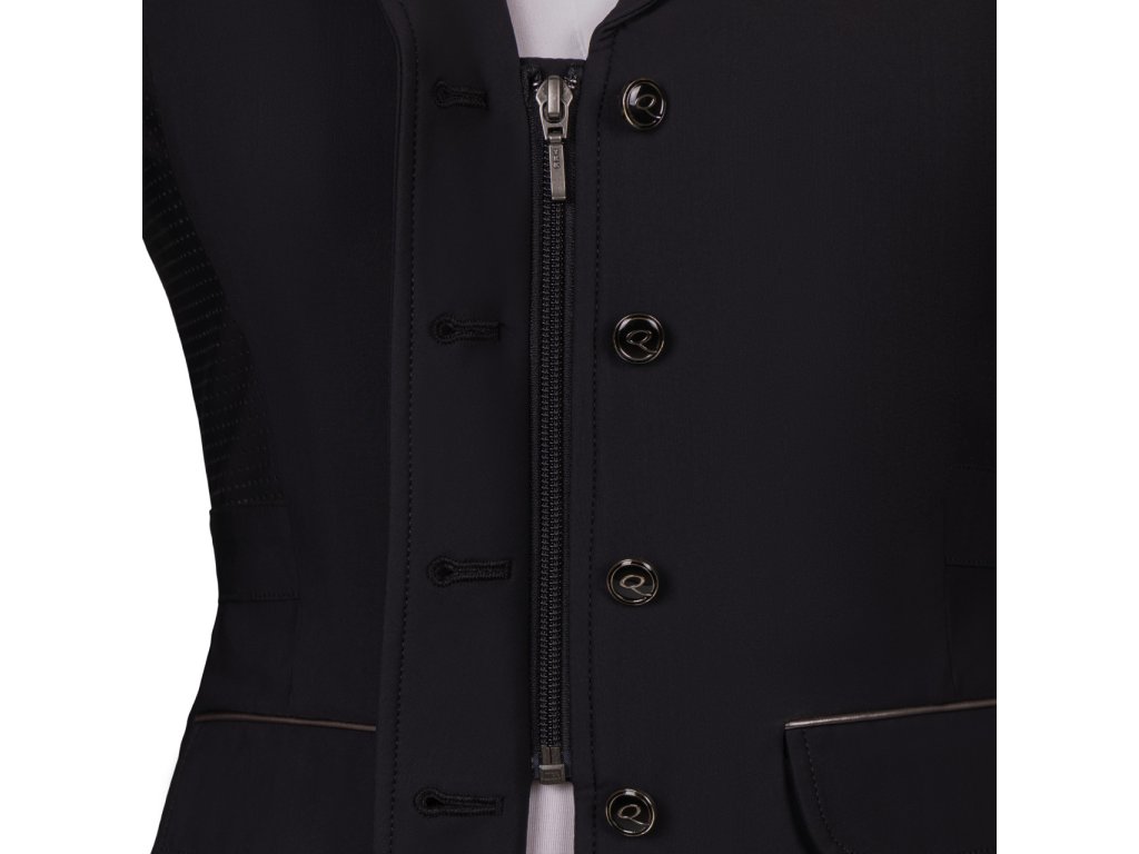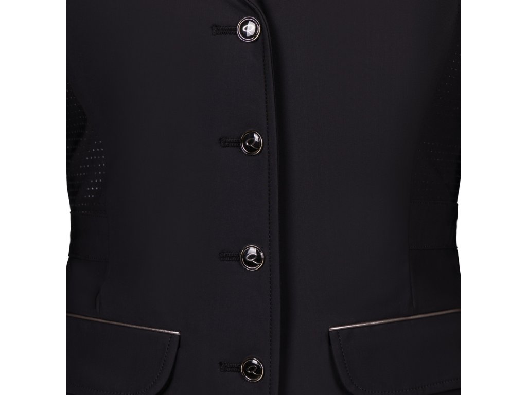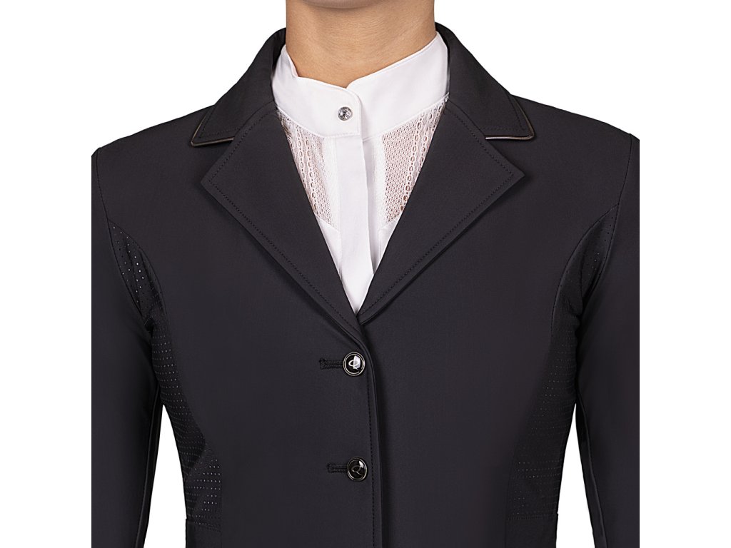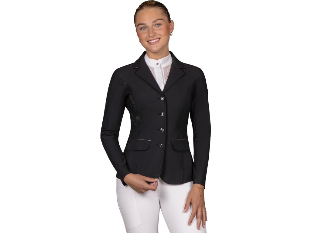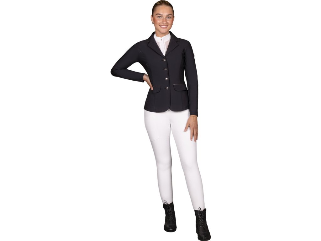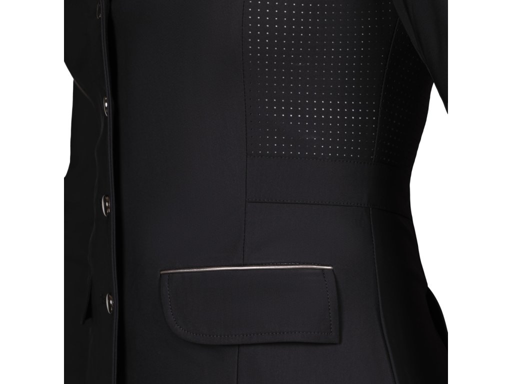 Wysokiej jakości frak konkursowy wykonany z lekkiego i oddychającego materiału. Rozciągliwy w czterech kierunkach materiał zapewnia komfort noszenia. Frak jest wyposażony w otwory wentylacyjne na plecach i pod pachami. Technologia mapowania ciała została wykorzystana do umieszczenia otworów wentylacyjnych w celu uzyskania najlepszego efektu. Kurtka jest zatem bardzo oddychająca i wygodna, odpowiednia na ciepłe letnie dni. Nie można pominąć dwóch bocznych kieszeni i podwójnego rozcięcia. Subtelne obszycie wokół kołnierza i kieszeni kreuje elegancki wygląd. Praktyczne zapięcie na zamek błyskawiczny i guziki. Modelka na zdjęciach ma 172 cm wzrostu i nosi rozmiar 36.