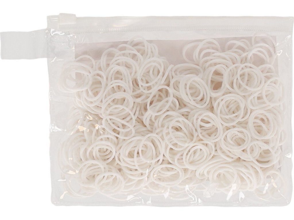 Białe gumki do zaplatania grzywy w poręcznym woreczku strunowym. Opakowanie zawiera około 450 sztuk gumek.