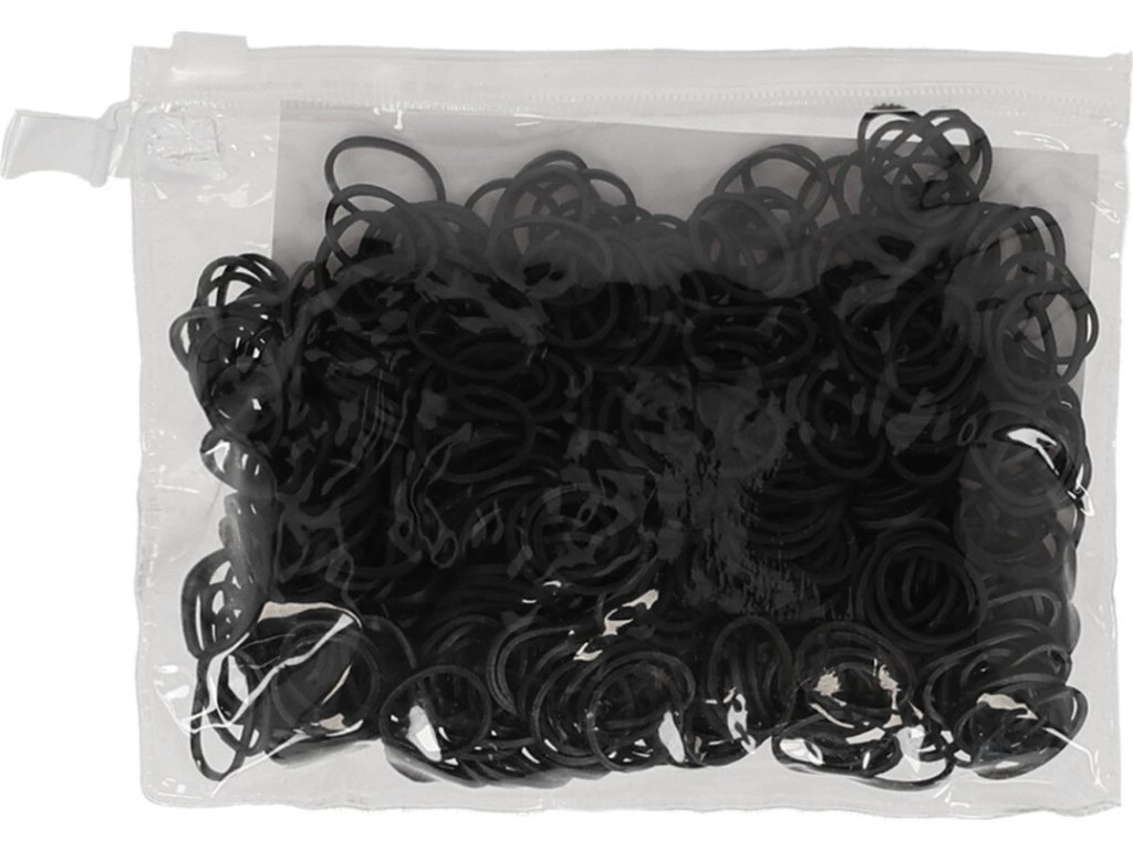 Czarne gumki do zaplatania grzywy w poręcznym woreczku strunowym. Opakowanie zawiera około 450 sztuk gumek.