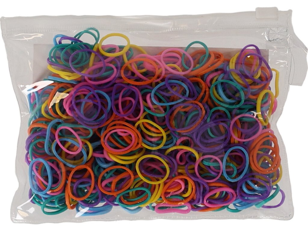 Kolorowe gumki do grzywy końskiej w poręcznym woreczku strunowym. Opakowanie zawiera około 450 sztuk gumek.