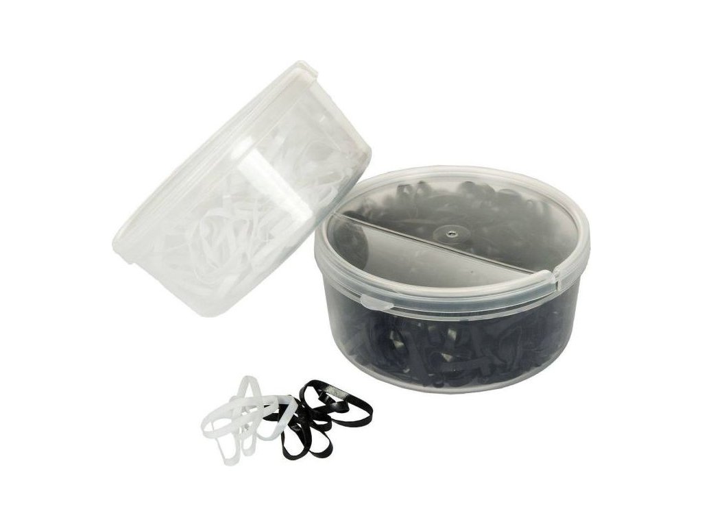 Bardzo szerokie białe gumki do grzywy w praktycznym zamykanym pudełku. Są bardzo elastyczne i jednocześnie odporne na rozerwanie. Opakowanie zawiera około 450 gumek.