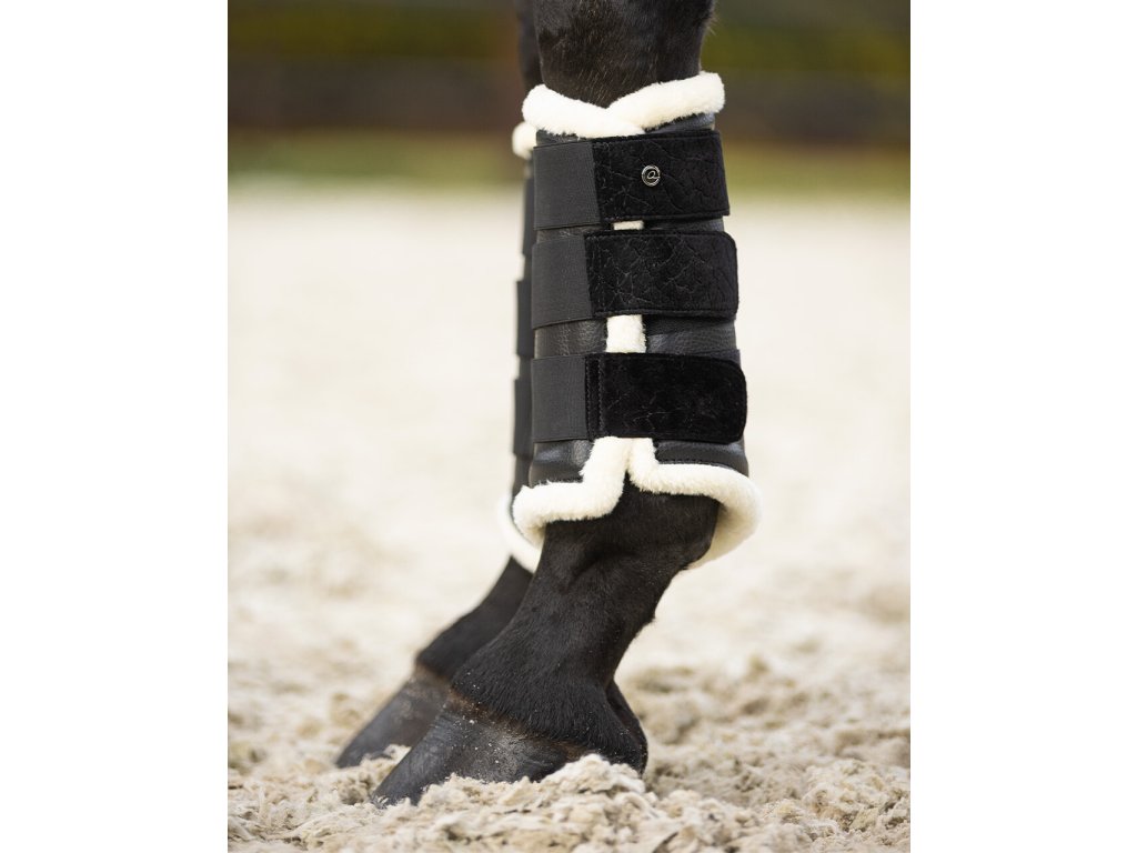 Wysokiej jakości ochraniacze na ścięgna odpowiednie zarówno na przednie, jak i tylne nogi. Posiadają miękką wyściółkę ze sztucznej skóry jagnięcej i trzy mocne zapięcia na rzepy. Wykonane ze sztucznej skóry i ozdobione eleganckim wzorem krokodylej skóry. Ochraniacze na ścięgna są dostępne w dwóch kolorach i idealnie pasują do innych produktów z kolekcji Julin. Część kolekcji jesień/zima 2023/2024.