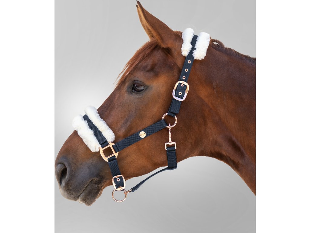 Wysokiej jakości i elegancki kantar z okuciami w kolorze różowego złota. Kantar jest regulowany i posiada miękkie podszycie ze sztucznej wełny na nachrapniku i potylicy, zapewniające maksymalny komfort. Dostępny w wielu opcjach kolorystycznych. Idealnie pasuje do pozostałych produktów z kolekcji Modern Rosé.