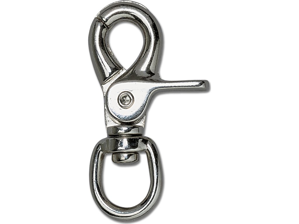 Karabińczyk obrotowy do wodzy. Szerokość oczka: 1,5 cm Długość całkowita: 5,5 cm.