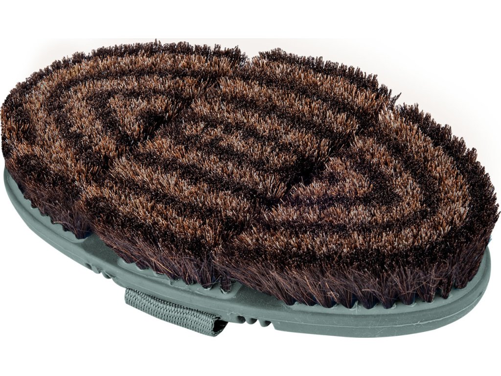 Szczotka wykonana z końskiego włosia. Doskonale usuwa kurz, brud, luźną sierść i zapewnia, że sierść jest pięknie lśniąca po szczotkowaniu. Dzięki podwójnemu zagięciu, szczotka jest delikatna dla nadgarstka i idealnie przylega do konia. Długość szczotki wynosi 18,5 cm, a włosie ma 2,5 cm długości. Dostępne w wielu kolorach.