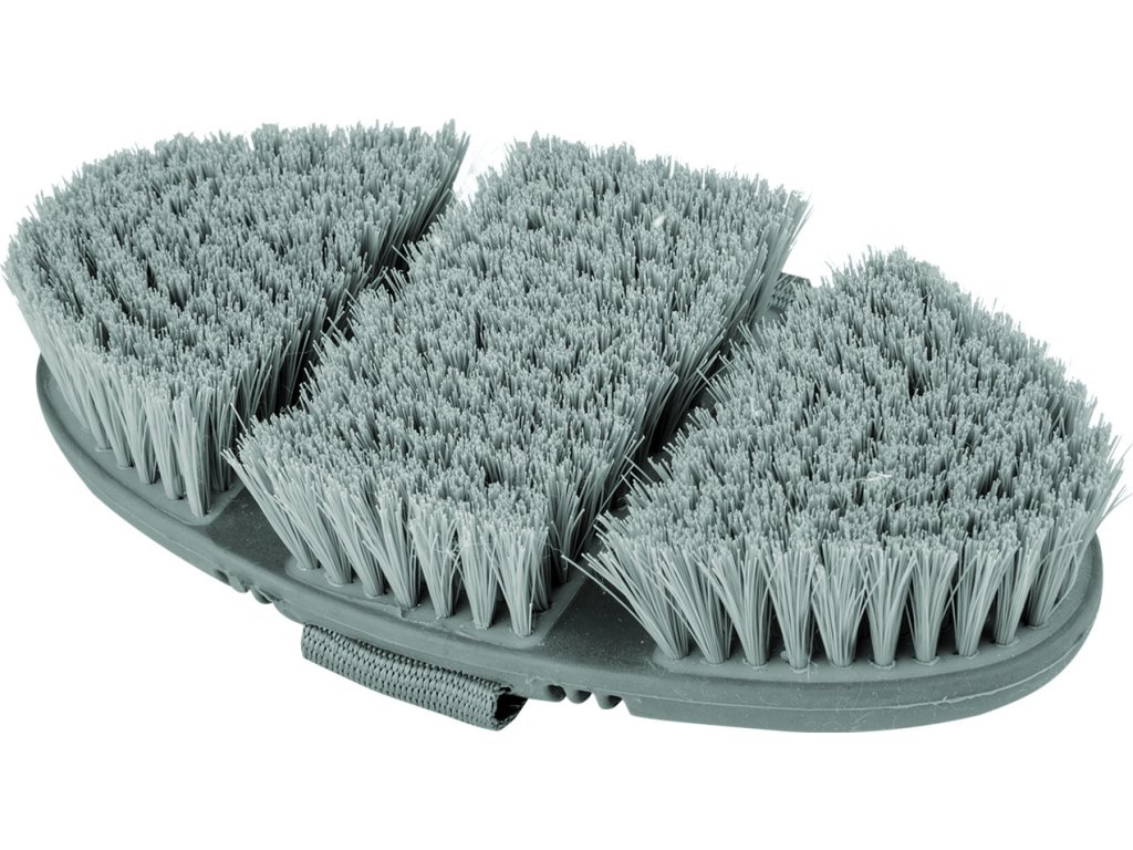 Ta szczotka jest wykonana z syntetycznego włosia, które usuwa drobny pył i grube zabrudzenia. Dzięki podwójnemu zagięciu, szczotka jest delikatna dla nadgarstka i idealnie dopasowuje się do konia. Długość grzbietu wynosi 18,5 cm, a włosie ma długość 2,5 cm. Dostępne w wielu kolorach.
